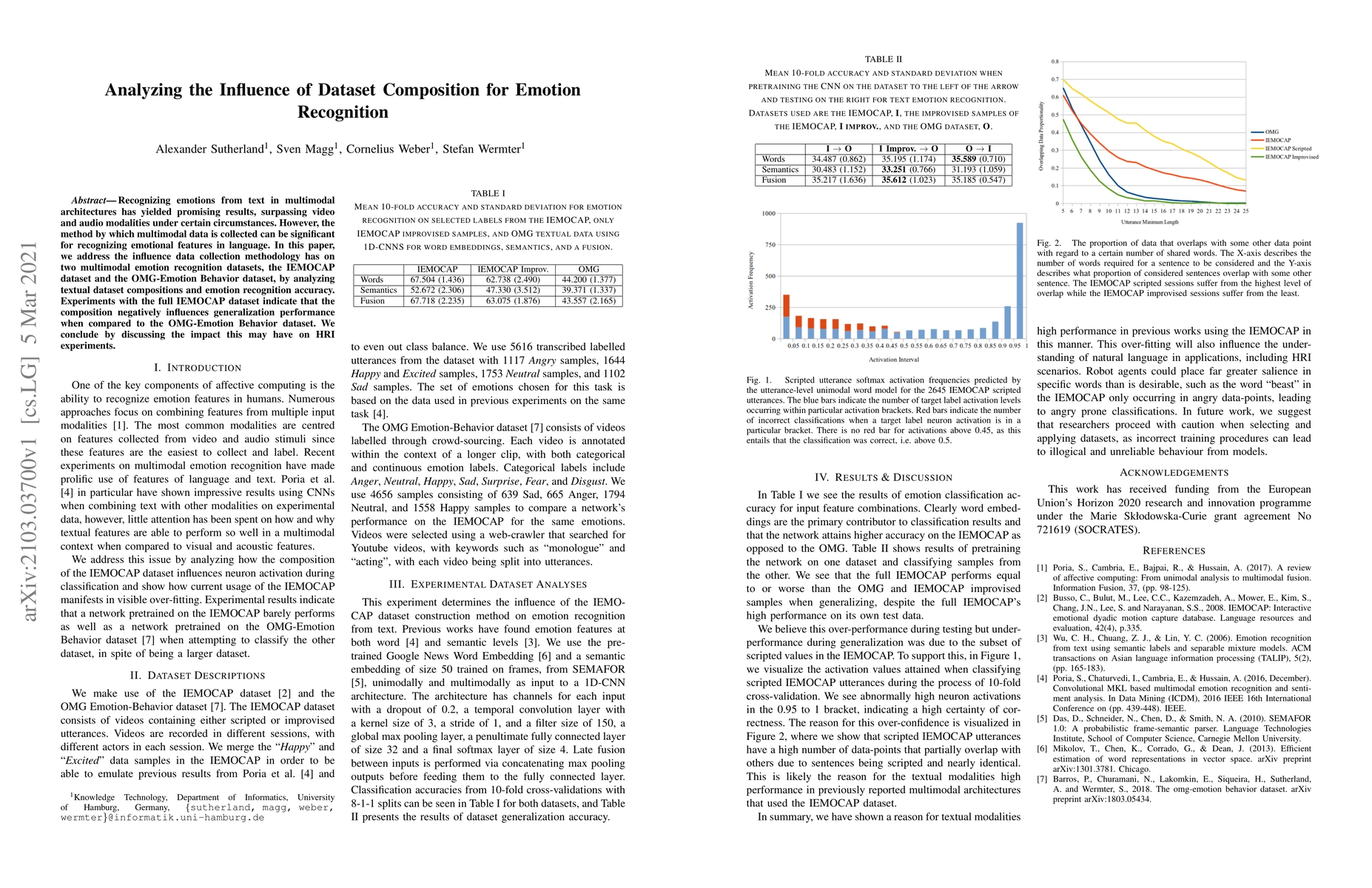 Analyzing two multimodal emotion recognition datasets reveals that dataset composition negatively affects generalization performance for emotional features in language. This finding has implications for Human-Computer Interaction (HRI) experiments.