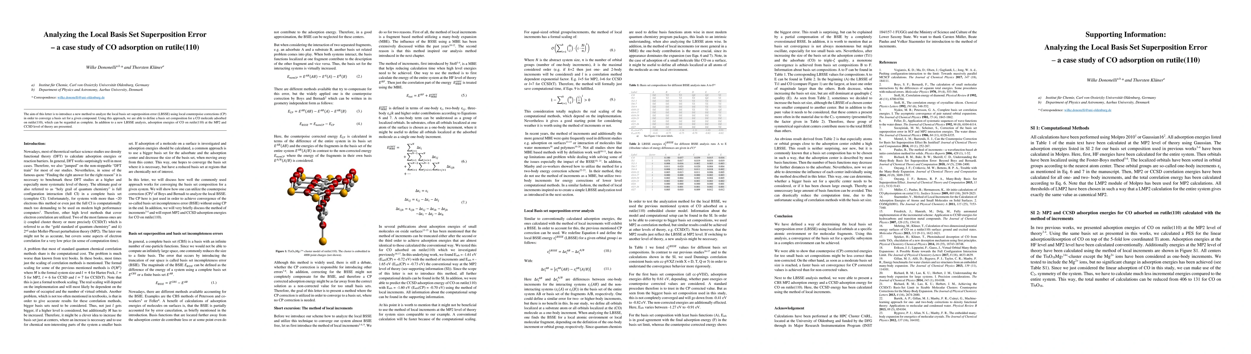 This paper introduces a novel method to analyze local basis set superposition error (LBSSE) using local counterpoise corrections to determine a complete basis set for CO adsorbed on rutile(110). It also presents adsorption energies of CO on rutile(110) at MP2 and CCSD levels of theory.