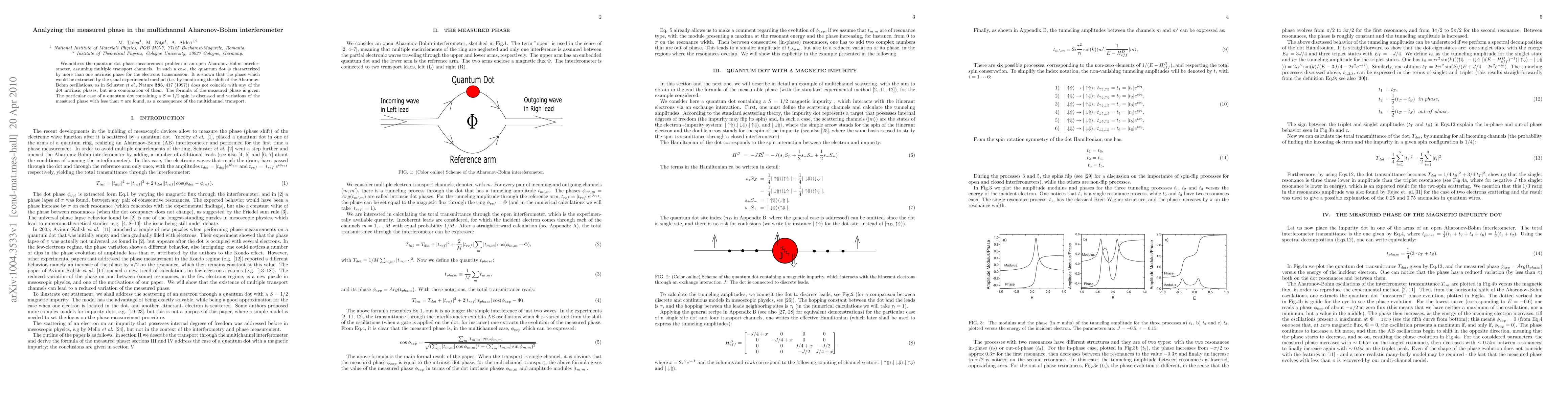 This paper investigates the phase measurement in a multichannel Aharonov-Bohm interferometer with quantum dots, revealing that the measured phase is a combination of multiple intrinsic phases rather than a single one. It also explores the case of a quantum dot with a $S=1/2$ spin and finds that the measured phase can vary by less than $\pi$ due to multichannel transport effects.