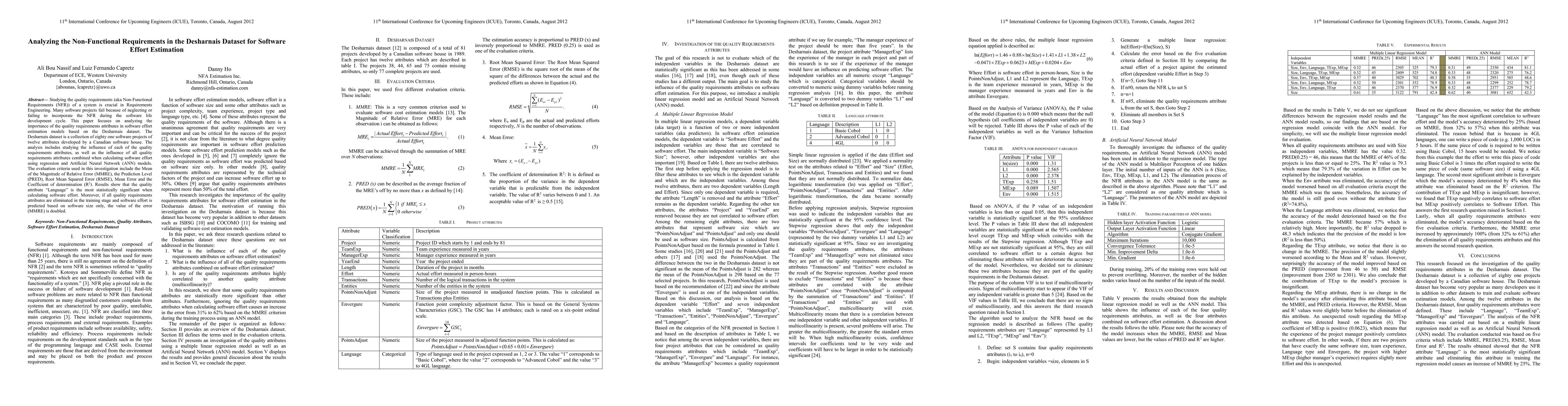 This paper analyzes the impact of Non-Functional Requirements (NFR) on software effort estimation using the Desharnais dataset, revealing that the quality attribute "Language" is most significant. The study shows that excluding all NFR attributes doubles the error when estimating effort based on software size alone.