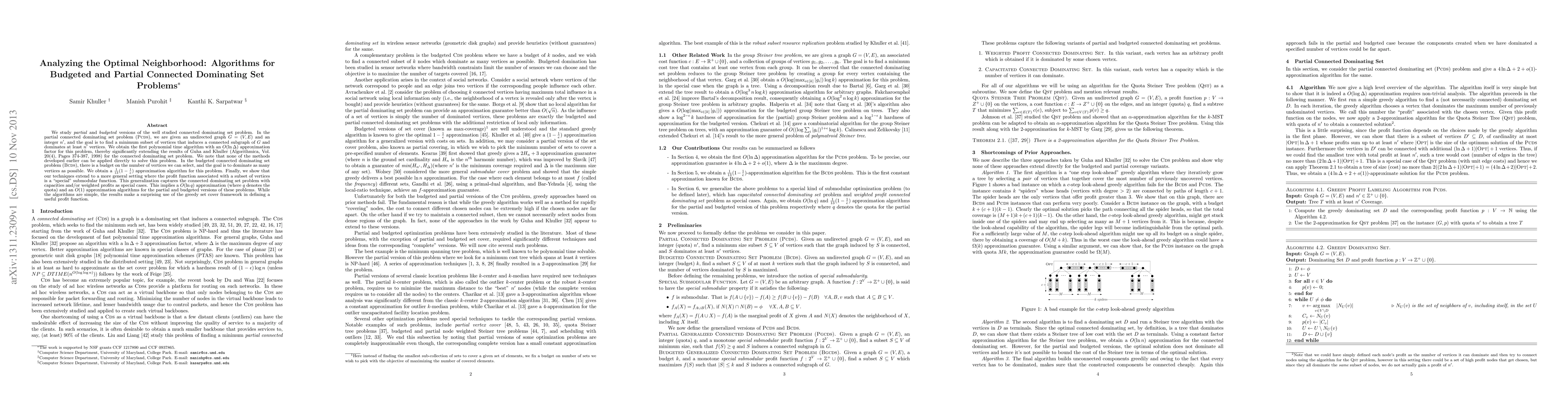 We study partial and budgeted versions of the well studied connected dominating set problem. In the partial connected dominating set problem, we are given an undirected graph G = (V,E) and an integer n', and the goal is to find a minimum subset of vertices that induces a connected subgraph of G and dominates at least n' vertices. We obtain the first polynomial time algorithm with an O(\ln \Delta) approximation factor for this problem, thereby significantly extending the results of Guha and Khuller (Algorithmica, Vol. 20(4), Pages 374-387, 1998) for the connected dominating set problem. We note that none of the methods developed earlier can be applied directly to solve this problem. In the budgeted connected dominating set problem, there is a budget on the number of vertices we can select, and the goal is to dominate as many vertices as possible. We obtain a (1/13)(1 - 1/e) approximation algorithm for this problem. Finally, we show that our techniques extend to a more general setting where the profit function associated with a subset of vertices is a monotone "special" submodular function. This generalization captures the connected dominating set problem with capacities and/or weighted profits as special cases. This implies a O(\ln q) approximation (where q denotes the quota) and an O(1) approximation algorithms for the partial and budgeted versions of these problems. While the algorithms are simple, the results make a surprising use of the greedy set cover framework in defining a useful profit function.