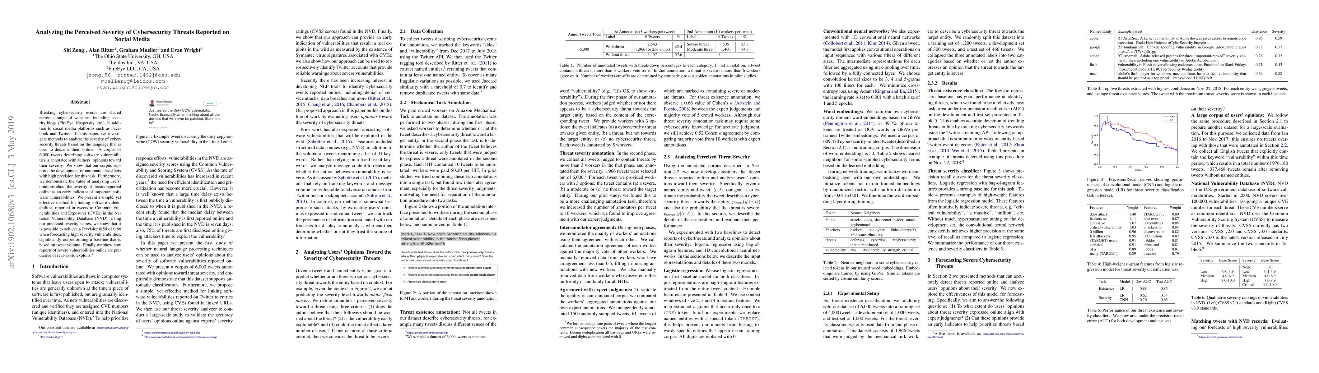 This paper investigates methods to analyze the perceived severity of cybersecurity threats described on social media, using a corpus of 6,000 tweets about software vulnerabilities. The study demonstrates the effectiveness of automatic classifiers in predicting threat severity and shows that online opinions can serve as early indicators of significant software vulnerabilities.