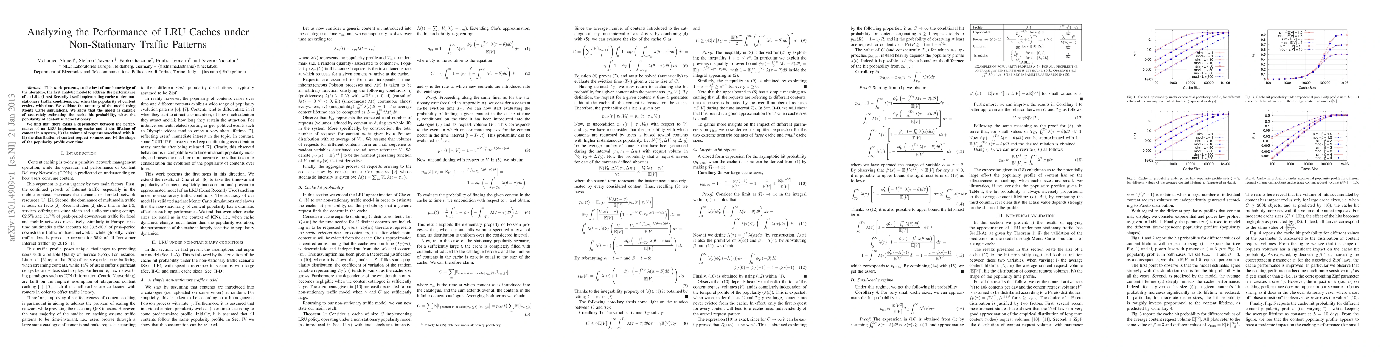 Researchers developed an analytic model to study LRU cache performance under non-stationary traffic patterns, finding that it accurately estimates cache hit probability and depends on content lifetime, volume of requests, request distribution, and popularity profile shape.