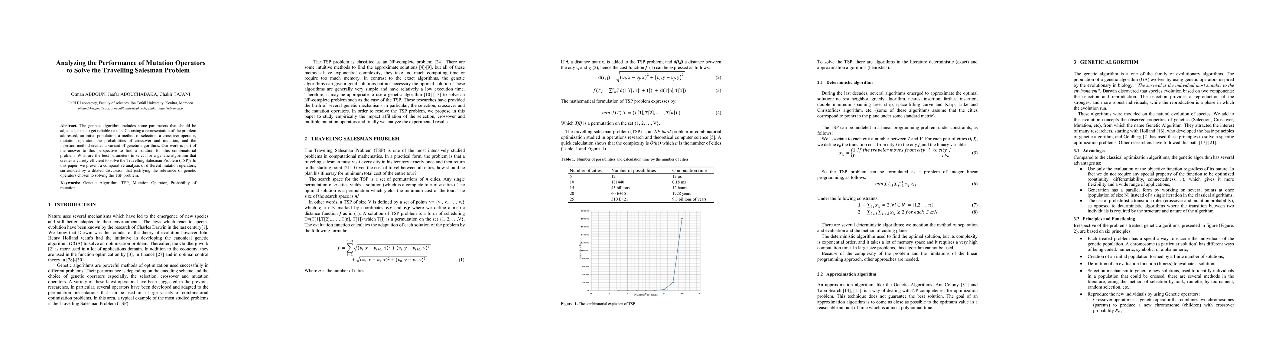 This paper investigates various mutation operators within genetic algorithms to determine the most effective parameters for solving the Travelling Salesman Problem (TSP). It provides a comparative analysis of these operators, highlighting their relevance and performance in addressing the TSP.