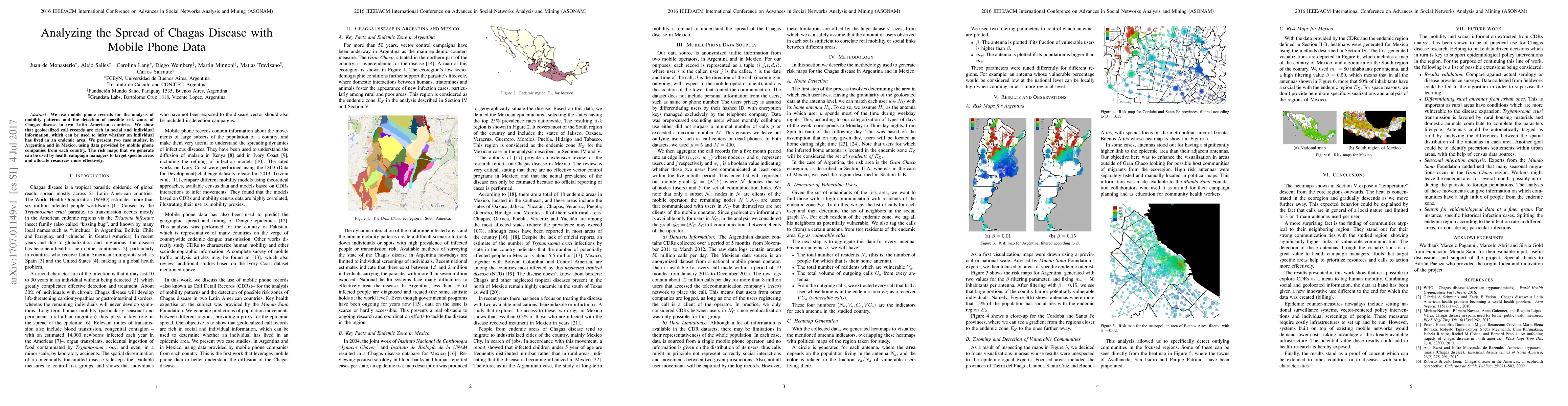 This study leverages mobile phone records to analyze mobility patterns and identify risk zones for Chagas disease in Argentina and Mexico, demonstrating how geolocalized call data can infer past exposure to endemic areas. The resulting risk maps enable targeted health campaigns and resource allocation.