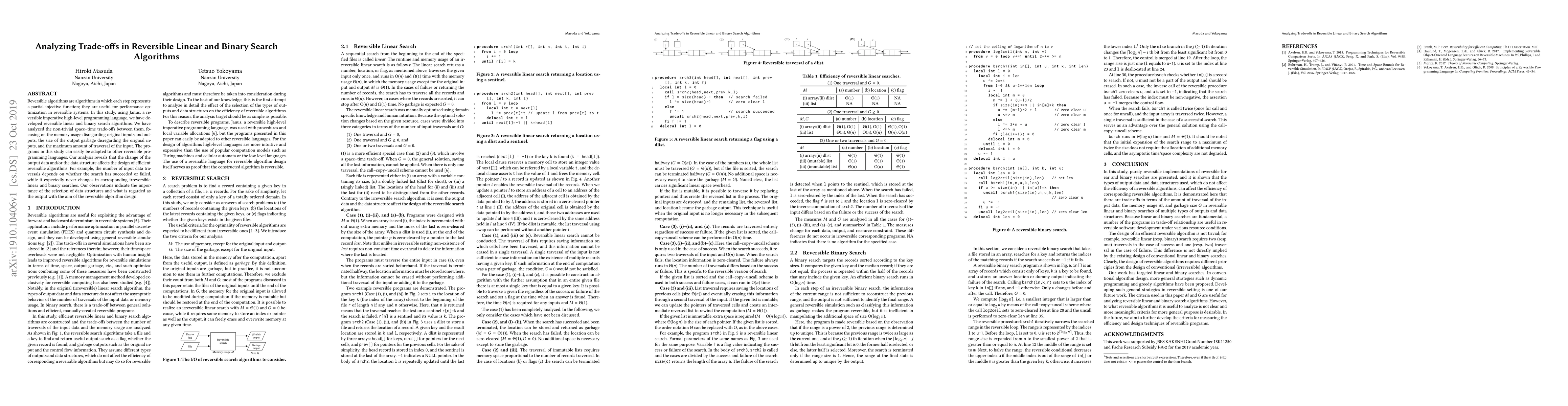Researchers developed reversible linear and binary search algorithms to optimize performance in reversible systems, finding that data structures and output selection significantly impact efficiency. Their analysis highlights the importance of carefully designing reversible algorithms to minimize space-time trade-offs.