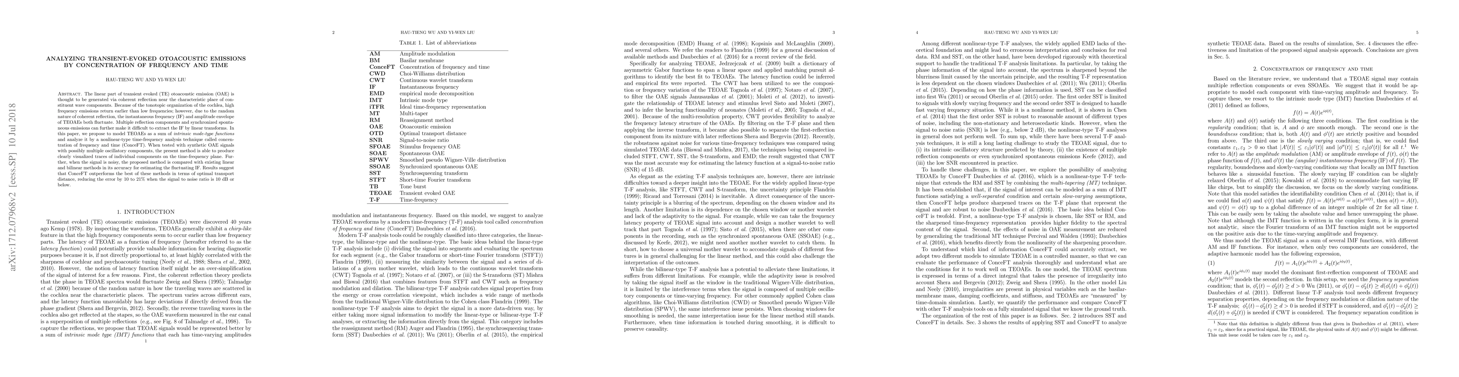The linear part of transient evoked (TE) otoacoustic emission (OAE) is thought to be generated via coherent reflection near the characteristic place of constituent wave components. Because of the tonotopic organization of the cochlea, high frequency emissions return earlier than low frequencies; however, due to the random nature of coherent reflection, the instantaneous frequency (IF) and amplitude envelope of TEOAEs both fluctuate. Multiple reflection components and synchronized spontaneous emissions can further make it difficult to extract the IF by linear transforms. In this paper, we propose to model TEOAEs as a sum of {\em intrinsic mode-type functions} and analyze it by a {nonlinear-type time-frequency analysis} technique called concentration of frequency and time (ConceFT). When tested with synthetic OAE signals {with possibly multiple oscillatory components}, the present method is able to produce clearly visualized traces of individual components on the time-frequency plane. Further, when the signal is noisy, the proposed method is compared with existing linear and bilinear methods in its accuracy for estimating the fluctuating IF. Results suggest that ConceFT outperforms the best of these methods in terms of optimal transport distance, reducing the error by 10 to {21\%} when the signal to noise ratio is 10 dB or below.