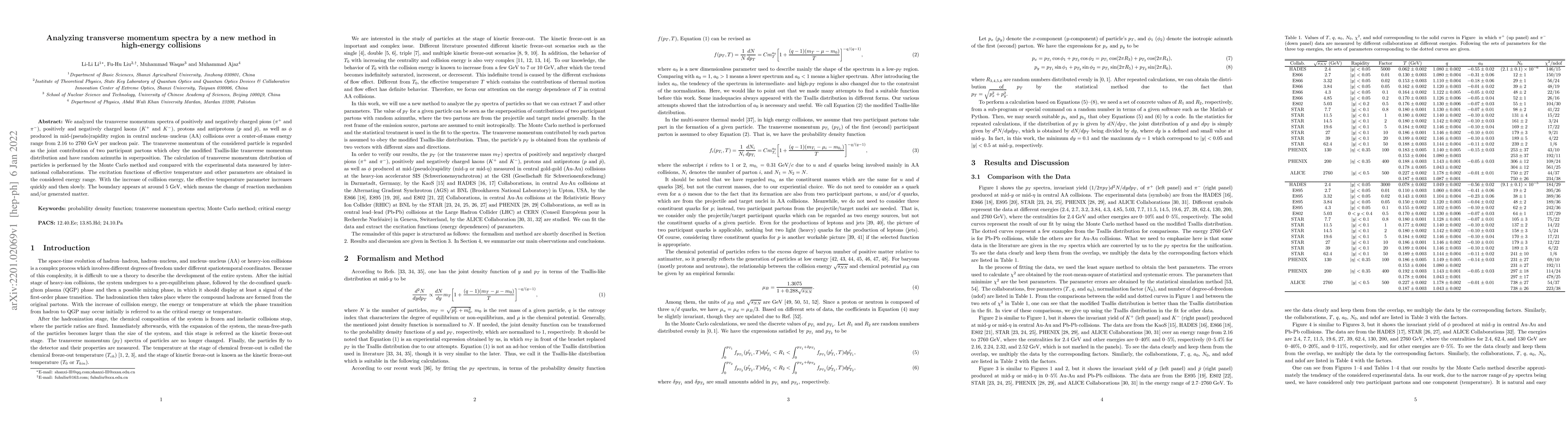We analyzed the transverse momentum spectra of positively and negatively charged pions ($\pi^+$ and $\pi^-$), positively and negatively charged kaons ($K^+$ and $K^-$), protons and antiprotons ($p$ and $\bar p$), as well as $\phi$ produced in mid-(pseudo)rapidity region in central nucleus--nucleus (AA) collisions over a center-of-mass energy range from 2.16 to 2760 GeV per nucleon pair. The transverse momentum of the considered particle is regarded as the joint contribution of two participant partons which obey the modified Tsallis-like transverse momentum distribution and have random azimuths in superposition. The calculation of transverse momentum distribution of particles is performed by the Monte Carlo method and compared with the experimental data measured by international collaborations. The excitation functions of effective temperature and other parameters are obtained in the considered energy range. With the increase of collision energy, the effective temperature parameter increases quickly and then slowly. The boundary appears at around 5 GeV, which means the change of reaction mechanism and/or generated matter.