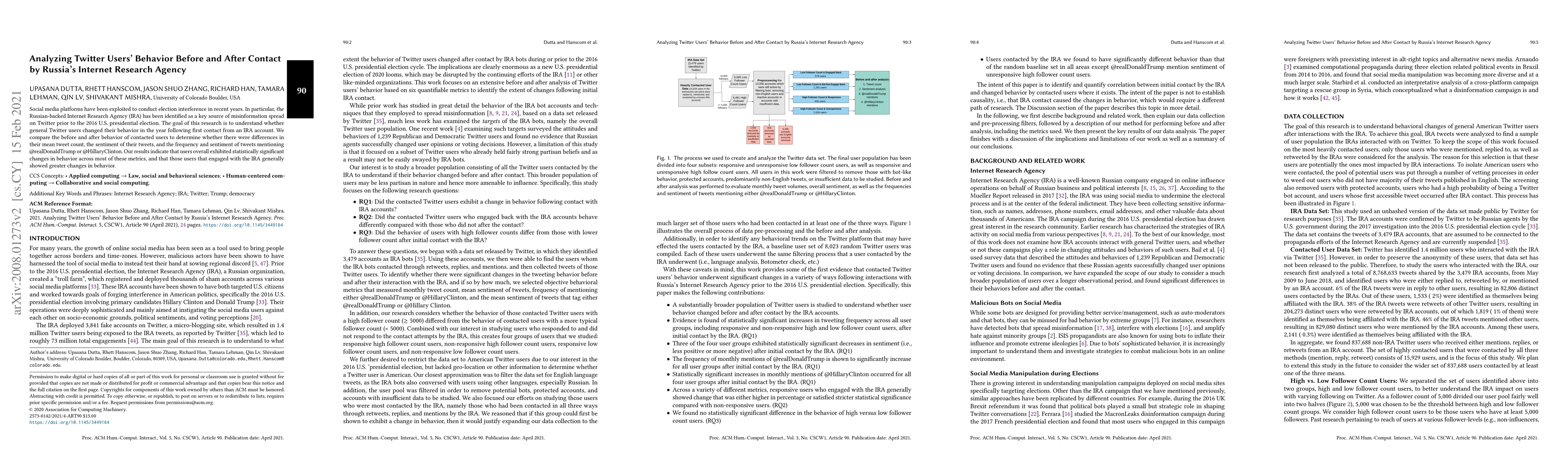 Social media platforms have been exploited to conduct election interference in recent years. In particular, the Russian-backed Internet Research Agency (IRA) has been identified as a key source of misinformation spread on Twitter prior to the 2016 U.S. presidential election. The goal of this research is to understand whether general Twitter users changed their behavior in the year following first contact from an IRA account. We compare the before and after behavior of contacted users to determine whether there were differences in their mean tweet count, the sentiment of their tweets, and the frequency and sentiment of tweets mentioning @realDonaldTrump or @HillaryClinton. Our results indicate that users overall exhibited statistically significant changes in behavior across most of these metrics, and that those users that engaged with the IRA generally showed greater changes in behavior.