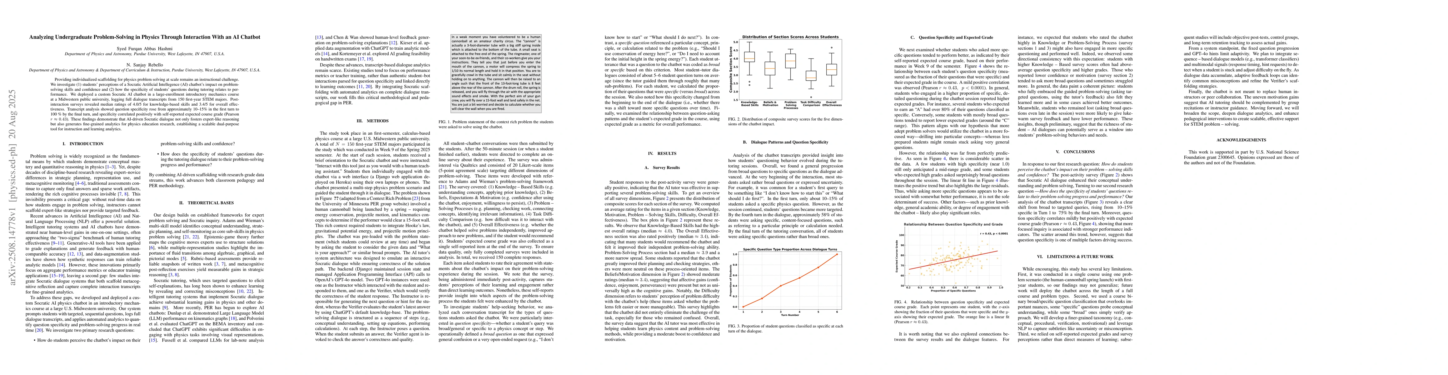 Providing individualized scaffolding for physics problem solving at scale remains an instructional challenge. We investigate (1) students' perceptions of a Socratic Artificial Intelligence (AI) chatbot's impact on problem-solving skills and confidence and (2) how the specificity of students' questions during tutoring relates to performance. We deployed a custom Socratic AI chatbot in a large-enrollment introductory mechanics course at a Midwestern public university, logging full dialogue transcripts from 150 first-year STEM majors. Post-interaction surveys revealed median ratings of 4.0/5 for knowledge-based skills and 3.4/5 for overall effectiveness. Transcript analysis showed question specificity rose from approximately 10-15% in the first turn to 100% by the final turn, and specificity correlated positively with self reported expected course grade (Pearson r = 0.43). These findings demonstrate that AI-driven Socratic dialogue not only fosters expert-like reasoning but also generates fine-grained analytics for physics education research, establishing a scalable dual-purpose tool for instruction and learning analytics.