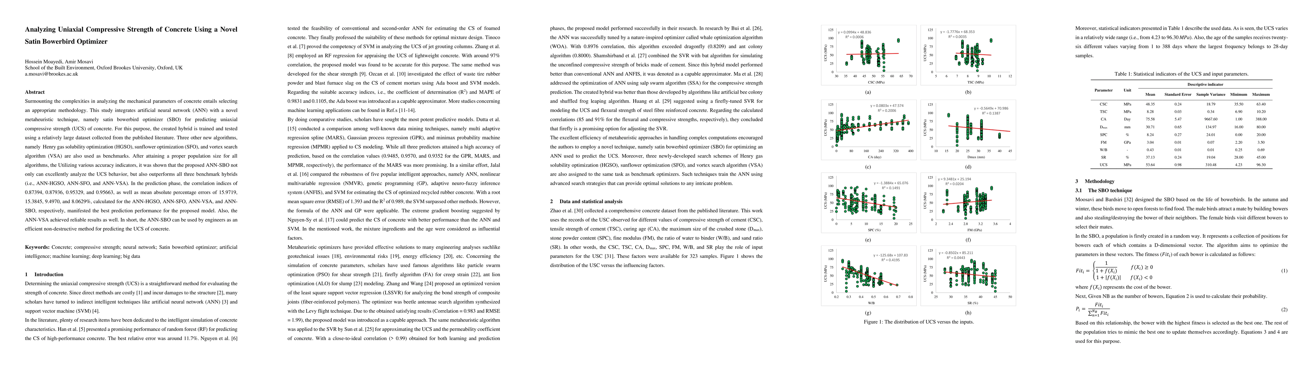 Surmounting the complexities in analyzing the mechanical parameters of concrete entails selecting an appropriate methodology. This study integrates an artificial neural network (ANN) with a novel metaheuristic technique, namely satin bowerbird optimizer (SBO) for predicting uniaxial compressive strength (UCS) of concrete. For this purpose, the created hybrid is trained and tested using a relatively large dataset collected from the published literature. Three other new algorithms, namely Henry gas solubility optimization (HGSO), sunflower optimization (SFO), and vortex search algorithm (VSA) are also used as benchmarks. After attaining a proper population size for all algorithms, Utilizing various accuracy indicators, it was shown that the proposed ANN-SBO not only can excellently analyze the UCS behavior, but also outperforms all three benchmark hybrids (i.e., ANN-HGSO, ANN-SFO, and ANN-VSA). In the prediction phase, the correlation indices of 0.87394, 0.87936, 0.95329, and 0.95663, as well as mean absolute percentage errors of 15.9719, 15.3845, 9.4970, and 8.0629%, calculated for the ANN-HGSO, ANN-SFO, ANN-VSA, and ANN-SBO, respectively, manifested the best prediction performance for the proposed model. Also, the ANN-VSA achieved reliable results as well. In short, the ANN-SBO can be used by engineers as an efficient non-destructive method for predicting the UCS of concrete.