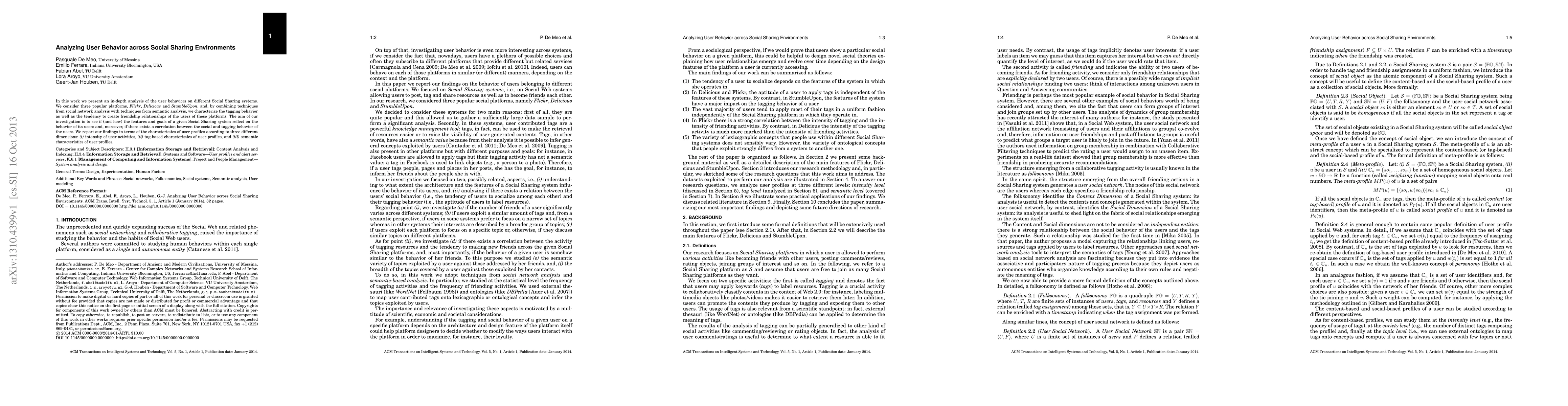 This study analyzes user behavior on three social sharing platforms (Flickr, Delicious, StumbleUpon) by combining social network analysis and semantic analysis techniques, focusing on tagging behavior and friendship creation.