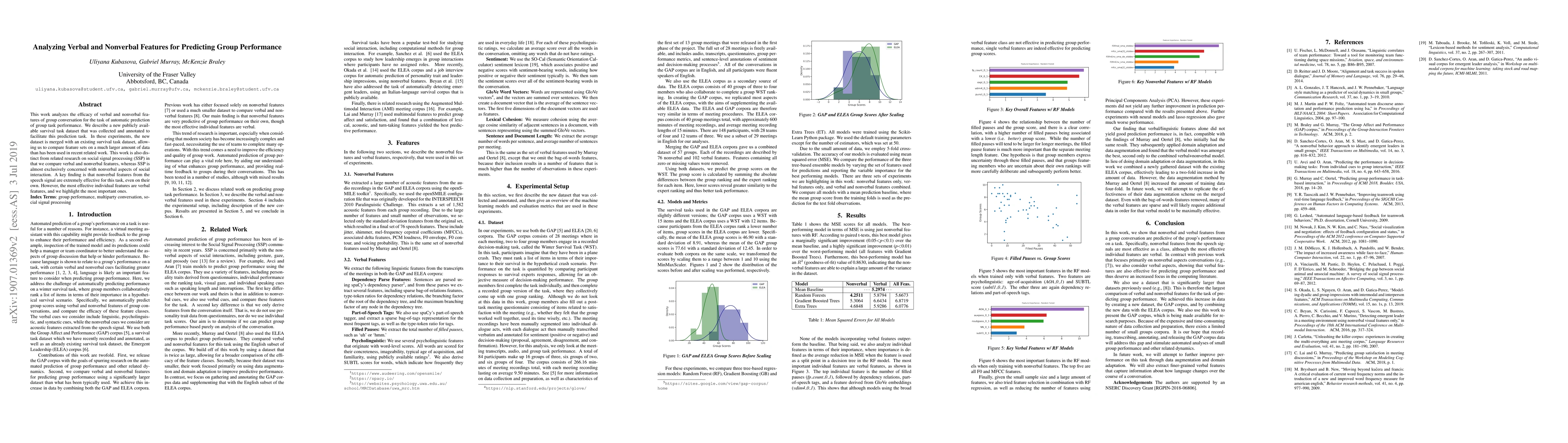 This research evaluates verbal and nonverbal features in group conversations to predict group performance, introducing a new dataset for this purpose. Nonverbal features from speech signals are highly effective, but verbal features, particularly certain key elements, are the most predictive.