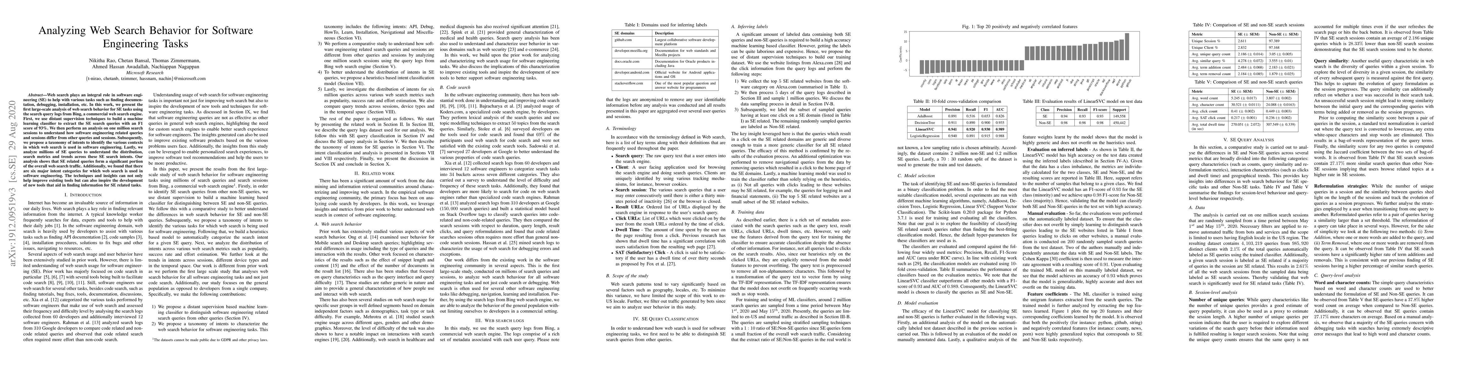This paper analyzes large-scale web search behavior for software engineering tasks using Bing search logs, identifying six major intent categories and revealing that SE-related queries constitute a significant portion of web search traffic. The study proposes a taxonomy to understand the contexts of SE web search and suggests improvements for existing tools and new tool development.