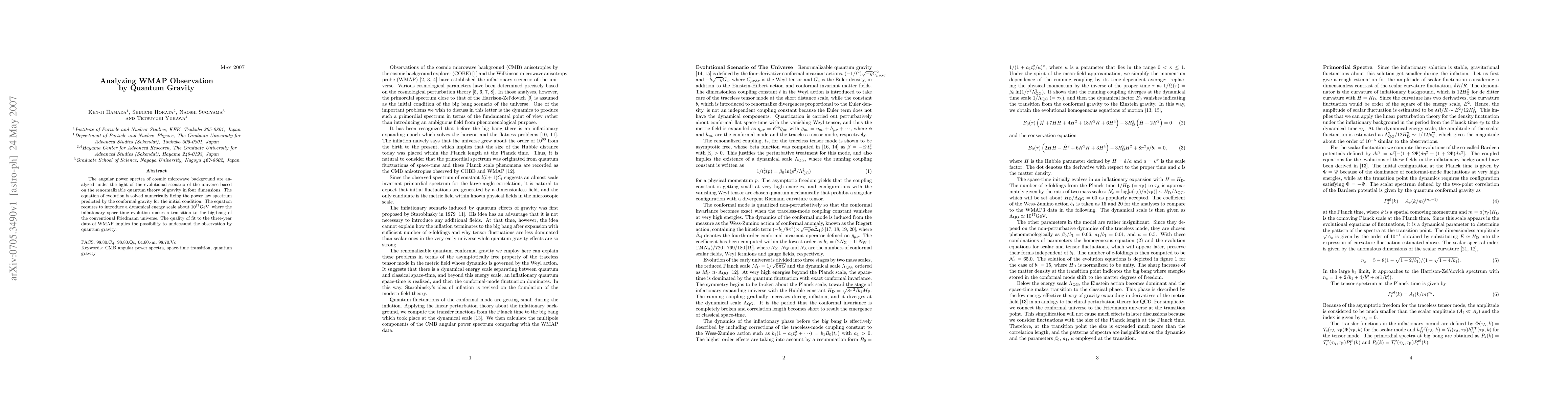 The angular power spectra of cosmic microwave background are analyzed under the light of the evolutional scenario of the universe based on the renormalizable quantum theory of gravity in four dimensions. The equation of evolution is solved numerically fixing the power law spectrum predicted by the conformal gravity for the initial condition. The equation requires to introduce a dynamical energy scale about 10^{17}GeV, where the inflationary space-time evolution makes a transition to the big-bang of the conventional Friedmann universe. The quality of fit to the three-year data of WMAP implies the possibility to understand the observation by quantum gravity.