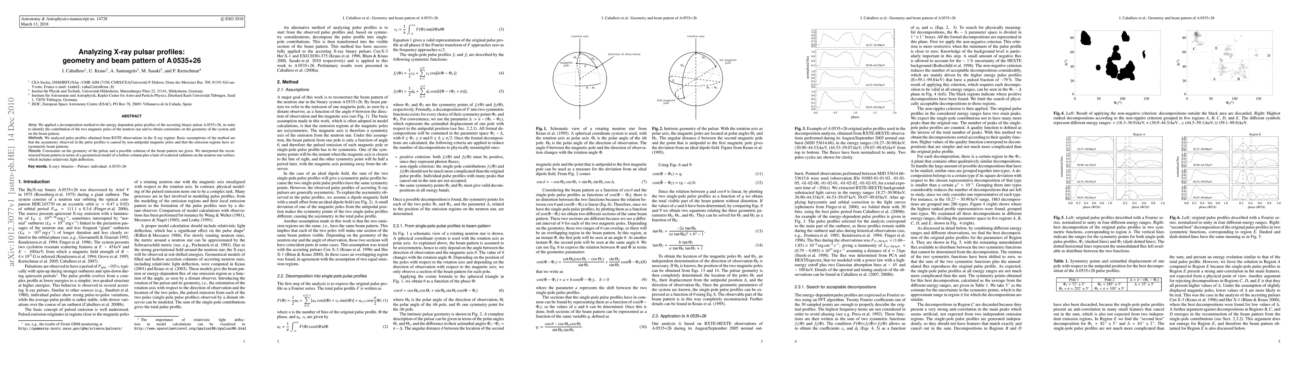 We applied a decomposition method to the energy dependent pulse profiles of the accreting binary pulsar A 0535+26, in order to identify the contribution of the two magnetic poles of the neutron star and to obtain constraints on the geometry of the system and on the beam pattern. We analyzed pulse profiles obtained from RXTE observations in the X-ray regime. Basic assumptions of the method are that the asymmetry observed in the pulse profiles is caused by non-antipodal magnetic poles and that the emission regions have axisymmetric beam patterns. Constraints on the geometry of the pulsar and a possible solution of the beam pattern are given. We interpreted the reconstructed beam pattern in terms of a geometrical model of a hollow column plus a halo of scattered radiation on the neutron star surface, which includes relativistic light deflection.