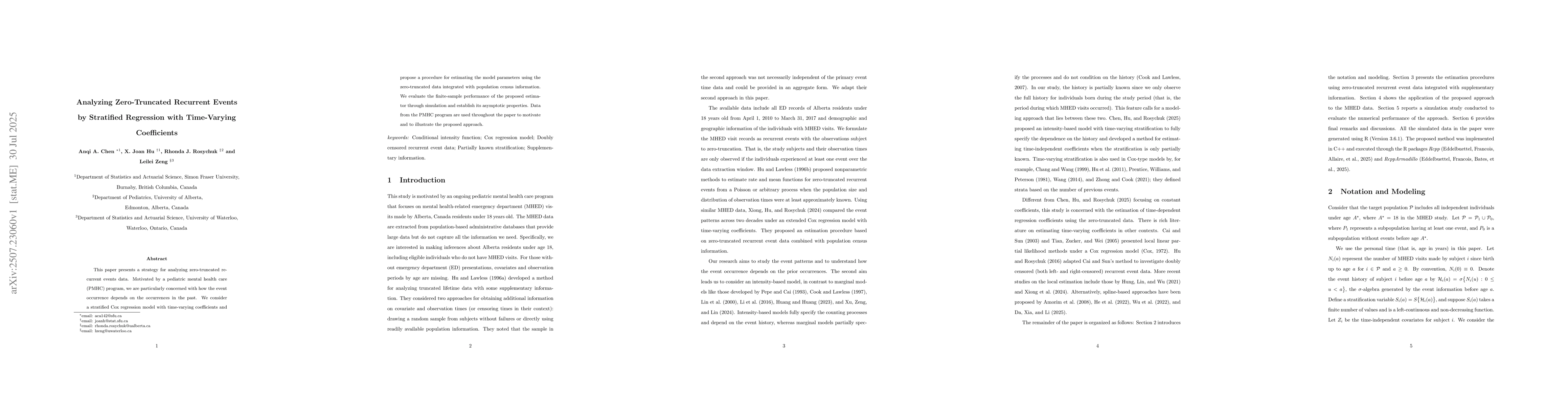This paper presents a strategy for analyzing zero-truncated recurrent events data. Motivated by a pediatric mental health care (PMHC) program, we are particularly concerned with how the event occurrence depends on the occurrences in the past. We consider a stratified Cox regression model with time-varying coefficients and propose a procedure for estimating the model parameters using the zero-truncated data integrated with population census information. We evaluate the finite-sample performance of the proposed estimator through simulation and establish its asymptotic properties. Data from the PMHC program are used throughout the paper to motivate and to illustrate the proposed approach.