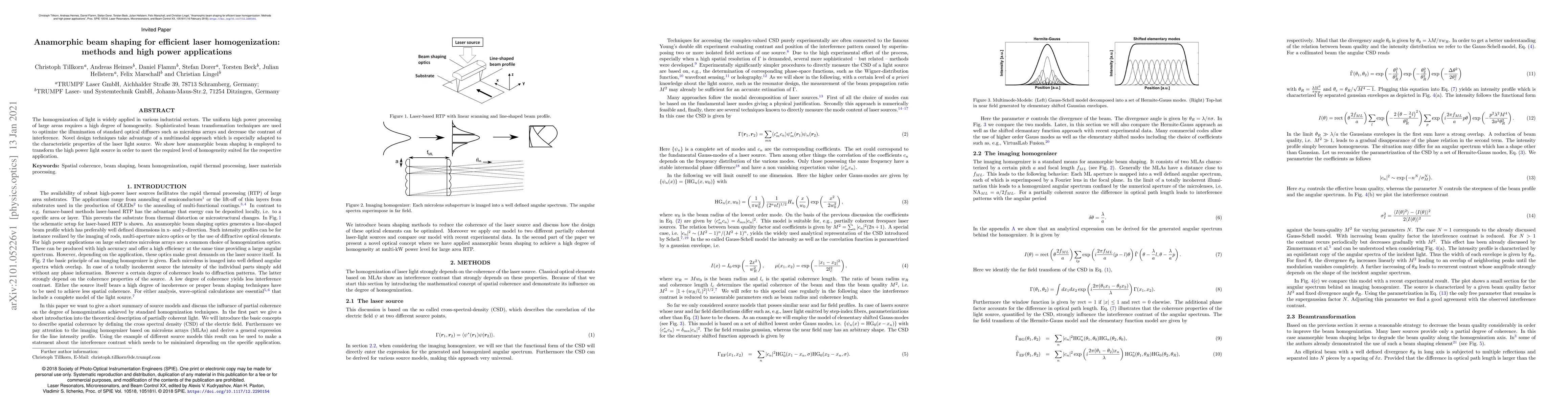 The homogenization of light is widely applied in various industrial sectors. The uniform high power processing of large areas requires a high degree of homogeneity. Sophisticated beam transformation techniques are used to optimize the illumination of standard optical diffusers such as microlens arrays and decrease the contrast of interference. Novel design techniques take advantage of a multimodal approach which is especially adapted to the characteristic properties of the laser light source. We show how anamorphic beam shaping is employed to transform the high power light source in order to meet the required level of homogeneity suited for the respective application.