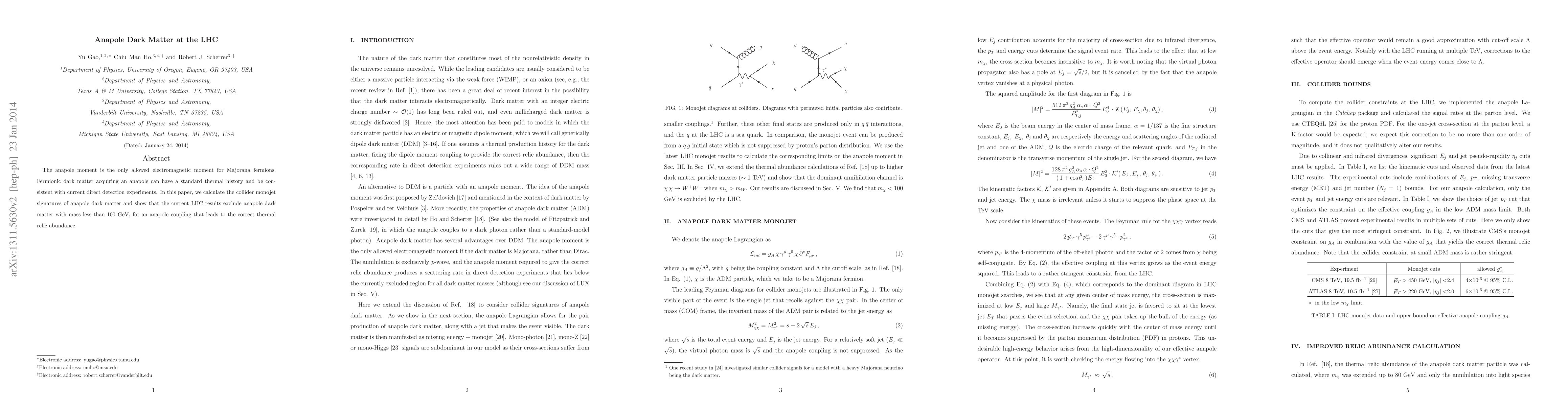This paper investigates anapole dark matter, a type of Majorana fermion with an anapole moment, and its potential detection at the LHC. It finds that current LHC results exclude anapole dark matter with a mass below 100 GeV under specific coupling conditions.