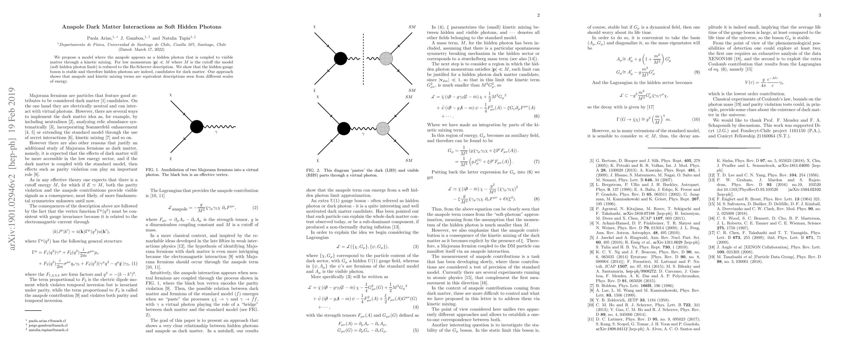 The research proposes a model where the anapole appears as a hidden photon coupled to visible matter through kinetic mixing. It reduces to the Ho-Scherrer description for low momentum, showing that hidden photons are stable and thus candidates for dark matter.