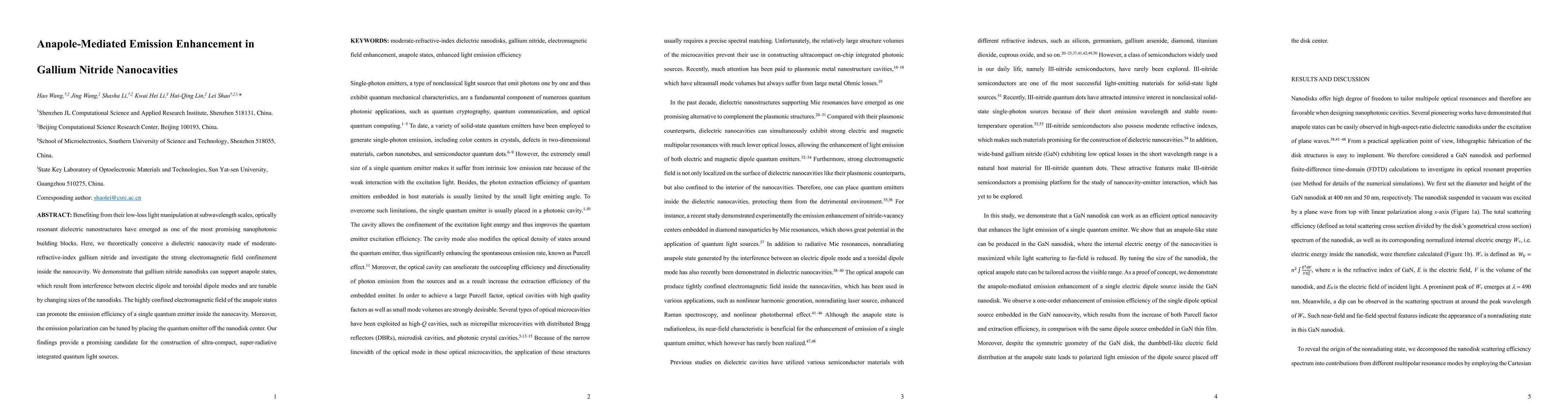 This paper proposes gallium nitride nanodisks supporting anapole states for enhanced emission efficiency of quantum emitters due to strong electromagnetic field confinement. The emission polarization can be tuned by displacing the quantum emitter, offering a pathway to ultra-compact, integrated quantum light sources.