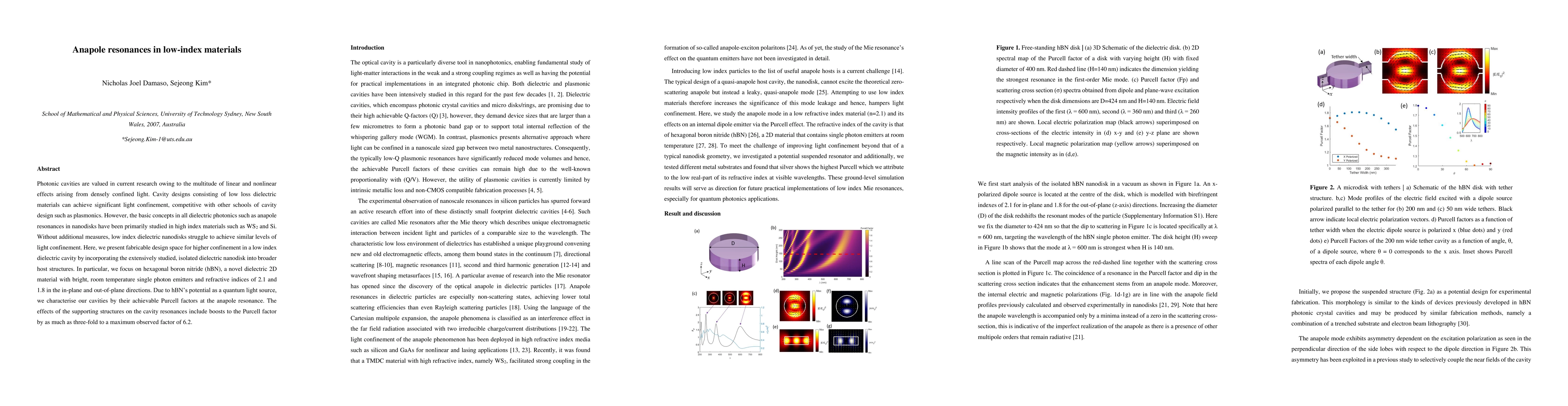 Photonic cavities are valued in current research owing to the multitude of linear and nonlinear effects arising from densely confined light. Cavity designs consisting of low loss dielectric materials can achieve significant light confinement, competitive with other schools of cavity design such as plasmonics. However, the basic concepts in all dielectric photonics such as anapole resonances in nanodisks have been primarily studied in high index materials such as WS2 and Si. Without additional measures, low index dielectric nanodisks struggle to achieve similar levels of light confinement. Here, we present fabricable design space for higher confinement in a low index dielectric cavity by incorporating the extensively studied, isolated dielectric nanodisk into broader host structures. In particular, we focus on hexagonal boron nitride (hBN), a novel dielectric 2D material with bright, room temperature single photon emitters and refractive indices of 2.1 and 1.8 in the inplane and out-of-plane directions. Due to hBN's potential as a quantum light source, we characterise our cavities by their achievable Purcell factors at the anapole resonance. The effects of the supporting structures on the cavity resonances include boosts to the Purcell factor by as much as three-fold to a maximum observed factor of 6.2.