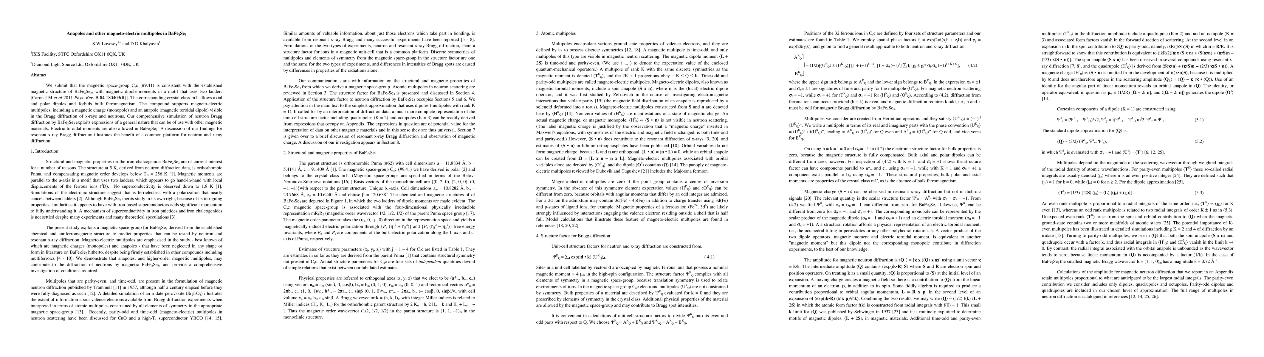 This research identifies magneto-electric multipoles in BaFe2Se3, including magnetic monopoles and anapole (magnetic toroidal dipole), supported by its magnetic space-group Cac (#9.41). The study also highlights the utility of a unified approach for neutron and x-ray diffraction data analysis.