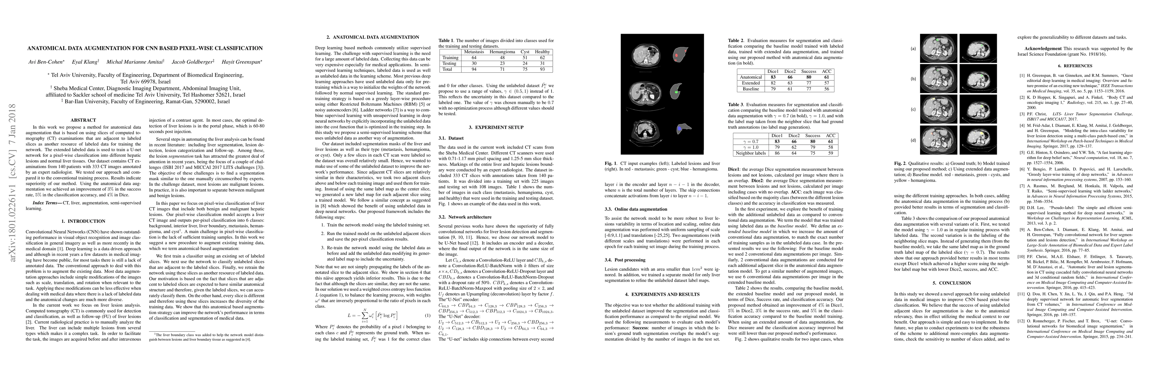 This paper proposes a method for anatomical data augmentation using adjacent CT slices to enhance labeled data for training a U-net network. The approach improves pixel-wise classification of hepatic lesions and normal liver tissues, achieving a 3% success rate, 5% accuracy, and 4% Dice improvement over conventional training.