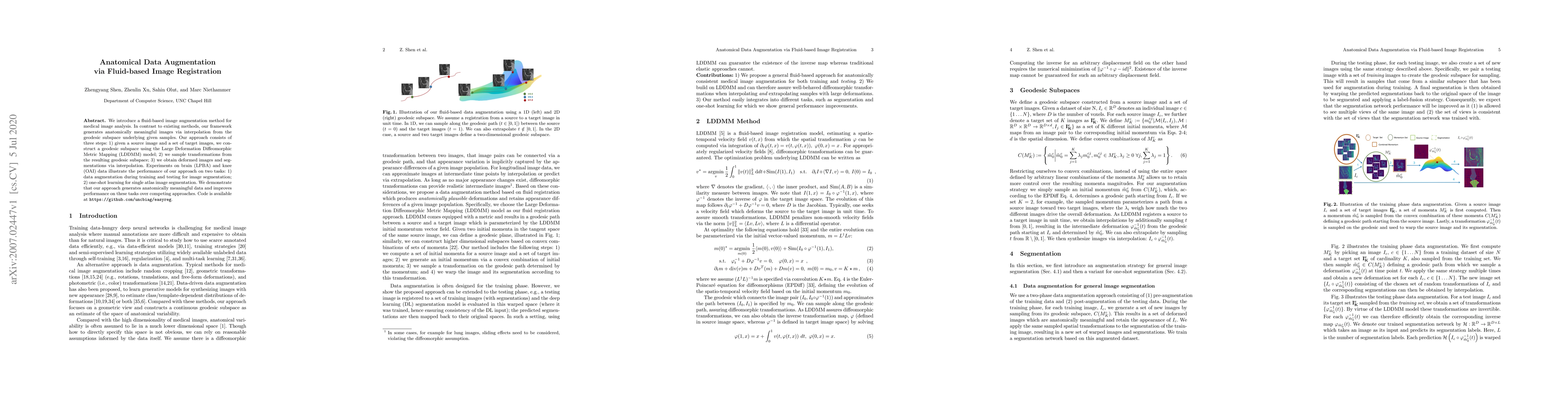 This paper proposes a fluid-based image augmentation method for medical image analysis, generating anatomically meaningful images via geodesic subspace interpolation using the LDDMM model. Experiments show improved performance in data augmentation and one-shot learning for image segmentation tasks on brain and knee datasets.