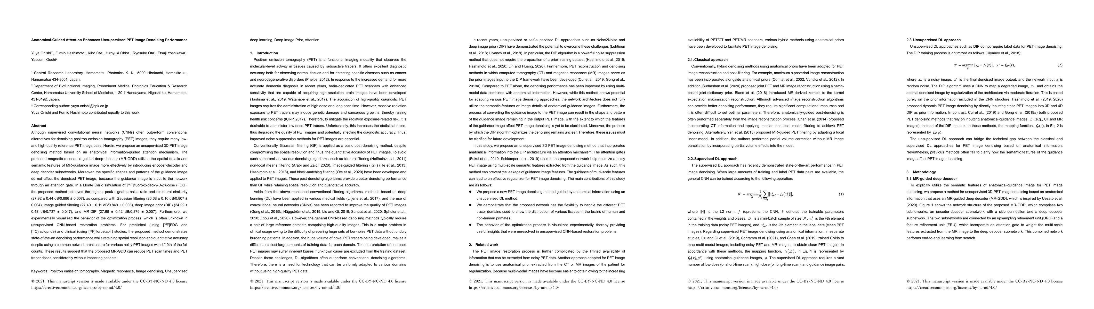 This paper proposes an unsupervised PET image denoising method using an anatomical information-guided attention mechanism called MR-GDD, which achieves superior denoised image quality compared to conventional methods and other deep learning approaches. The method effectively utilizes MR guidance images without affecting the denoised PET image, demonstrating state-of-the-art performance in preclinical and clinical studies.