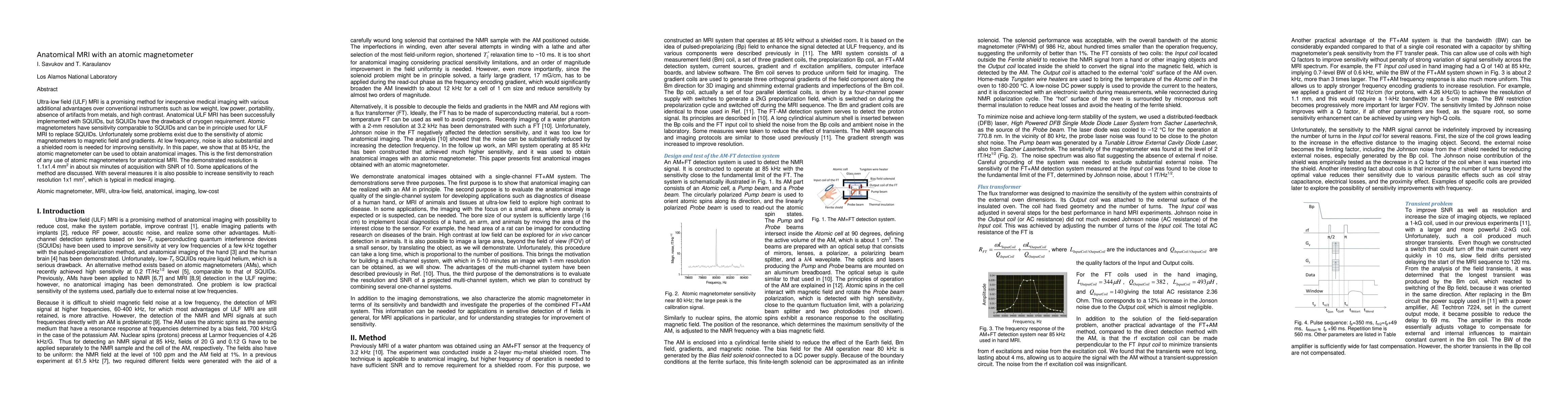 This paper demonstrates the first use of atomic magnetometers for ultra-low field (ULF) anatomical MRI, achieving a resolution of 1.1x1.4 mm² with a signal-to-noise ratio of 10. The method shows potential for increased sensitivity to reach typical medical imaging resolutions of 1x1 mm².