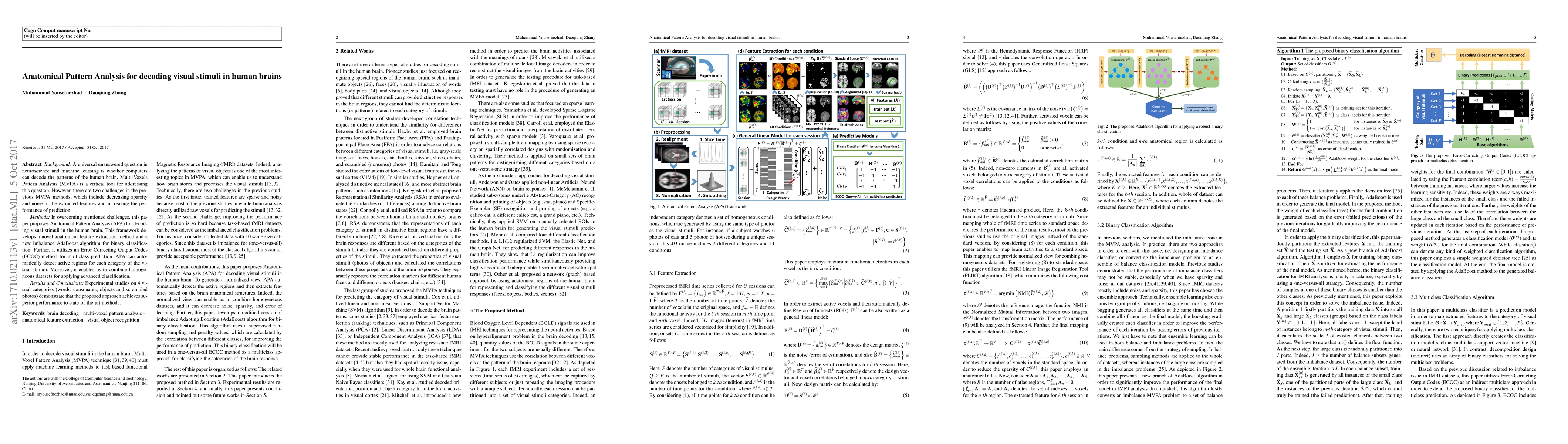 This paper introduces Anatomical Pattern Analysis (APA) to decode visual stimuli in human brains, addressing challenges in previous Multi-Voxels Pattern Analysis methods. APA employs a novel anatomical feature extraction and an improved AdaBoost algorithm, achieving superior performance over state-of-the-art methods in decoding four visual categories.