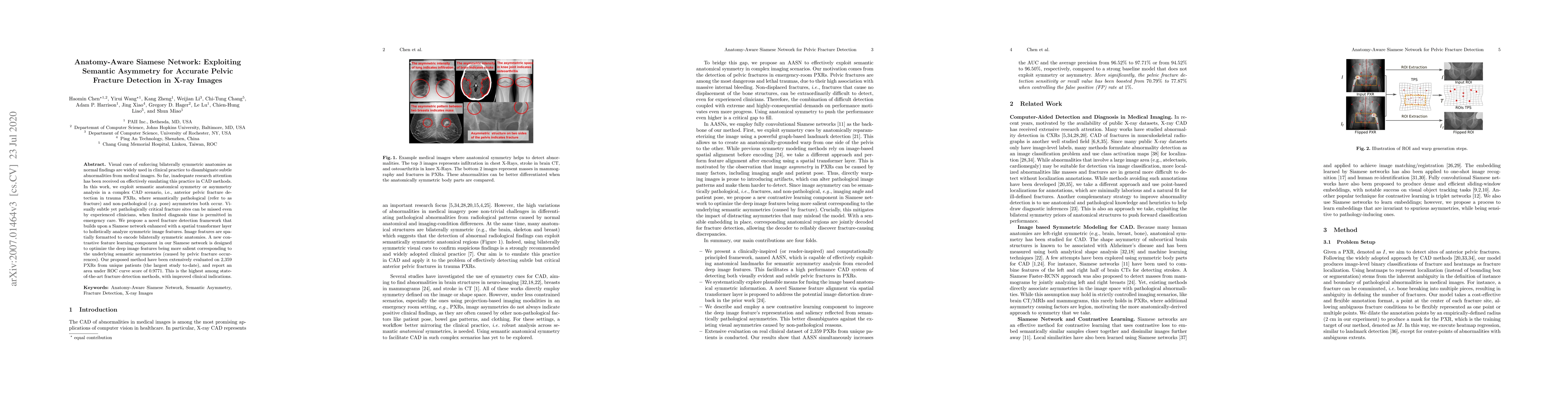 Visual cues of enforcing bilaterally symmetric anatomies as normal findings are widely used in clinical practice to disambiguate subtle abnormalities from medical images. So far, inadequate research attention has been received on effectively emulating this practice in CAD methods. In this work, we exploit semantic anatomical symmetry or asymmetry analysis in a complex CAD scenario, i.e., anterior pelvic fracture detection in trauma PXRs, where semantically pathological (refer to as fracture) and non-pathological (e.g., pose) asymmetries both occur. Visually subtle yet pathologically critical fracture sites can be missed even by experienced clinicians, when limited diagnosis time is permitted in emergency care. We propose a novel fracture detection framework that builds upon a Siamese network enhanced with a spatial transformer layer to holistically analyze symmetric image features. Image features are spatially formatted to encode bilaterally symmetric anatomies. A new contrastive feature learning component in our Siamese network is designed to optimize the deep image features being more salient corresponding to the underlying semantic asymmetries (caused by pelvic fracture occurrences). Our proposed method have been extensively evaluated on 2,359 PXRs from unique patients (the largest study to-date), and report an area under ROC curve score of 0.9771. This is the highest among state-of-the-art fracture detection methods, with improved clinical indications.