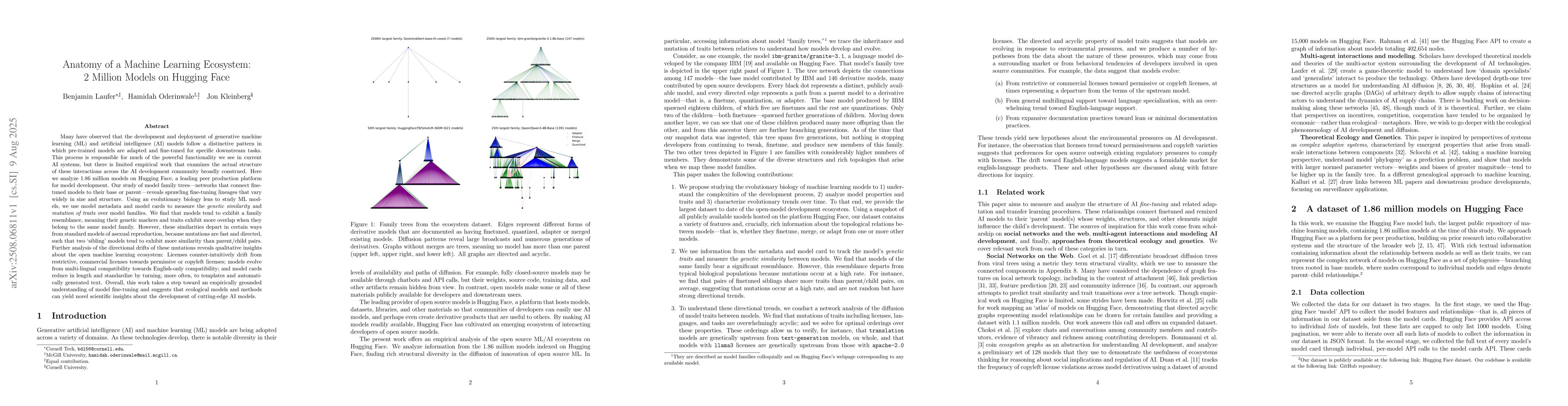 This study analyzes 1.86 million models on Hugging Face, a platform for model development, using an evolutionary biology lens. It examines model family trees, measuring genetic similarity and mutation of traits over model families through model metadata and model cards.