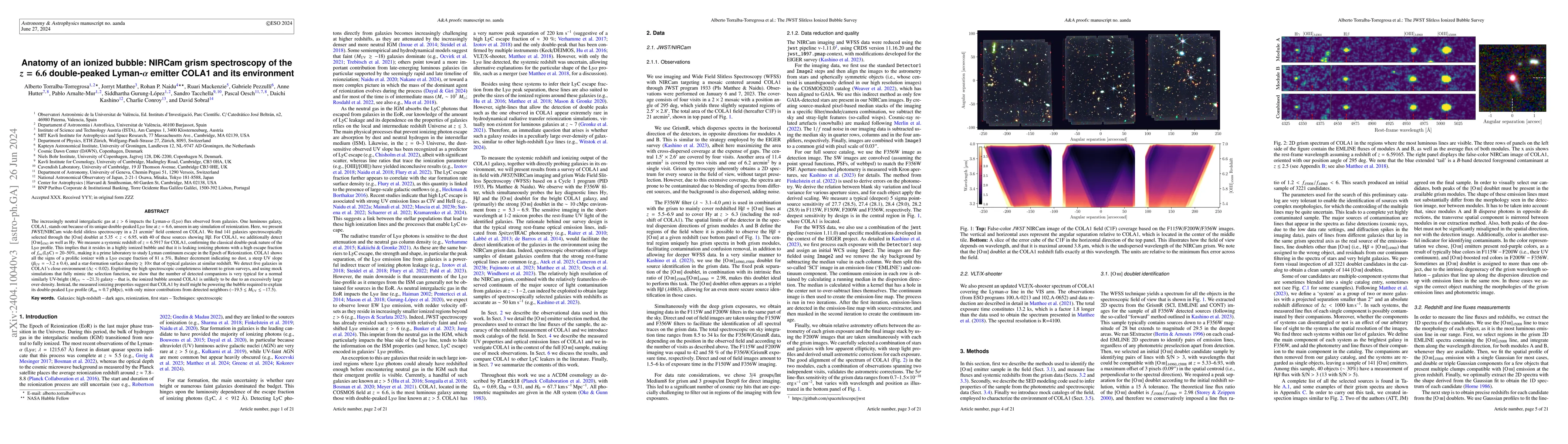 This research examines the galaxy COLA1 at $z=6.6$, notable for its double-peaked Lyman-$\alpha$ emission, and its environment using JWST/NIRCam spectroscopy. It finds COLA1 resides in a highly ionized bubble, indicating significant Lyman continuum photon leakage, with 81% escape fraction. The galaxy's surroundings show typical numbers of nearby companions, suggesting COLA1 alone likely powers its surrounding ionized region.