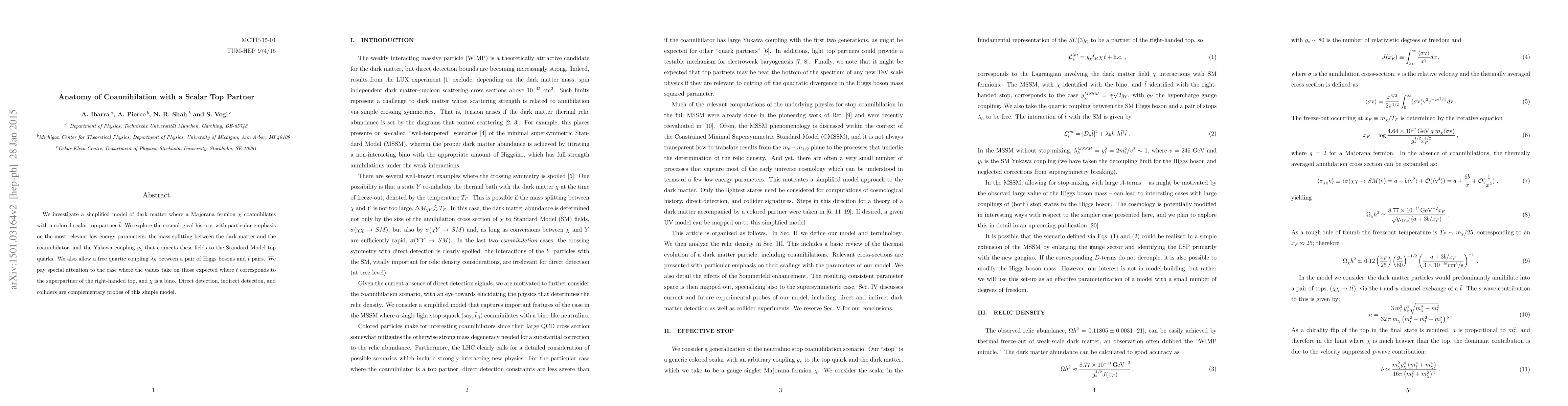 The research investigates a simplified model of dark matter where a Majorana fermion χ coannihilates with a colored scalar top partner τ~t. The study explores the cosmological history, focusing on the mass splitting between the dark matter and the coannihilator, and the Yukawa coupling yχ that connects these fields to the Standard Model top quarks. A free quartic coupling τ_h between a pair of Higgs bosons and τ~t pairs is also considered.