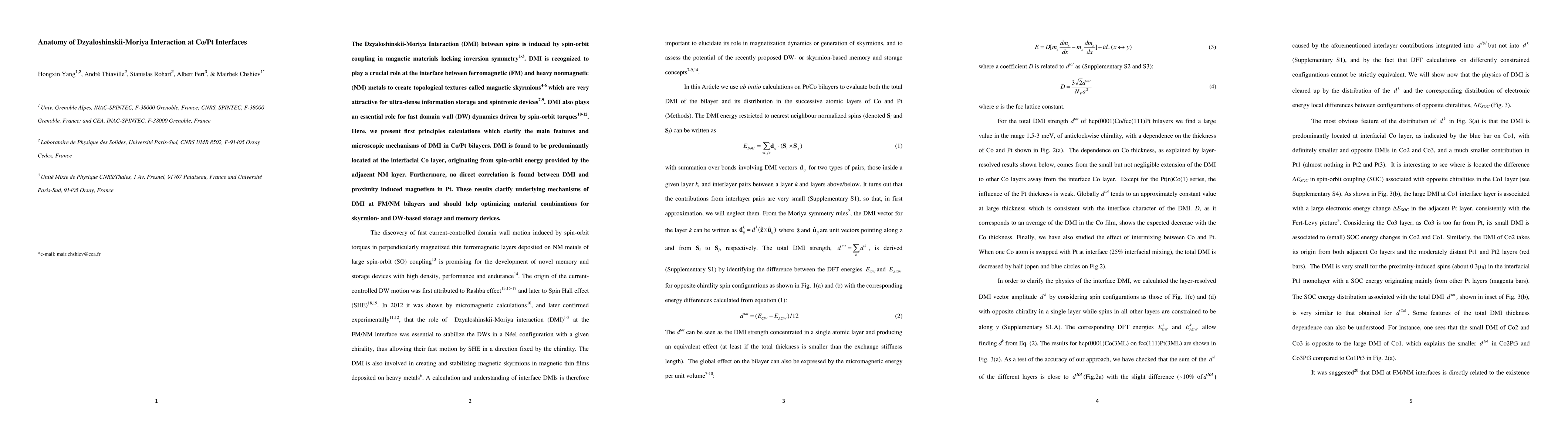 This paper uses first principles calculations to elucidate the Dzyaloshinskii-Moriya Interaction (DMI) in Co/Pt bilayers, revealing that DMI is mainly at the Co interface layer due to spin-orbit coupling from the Pt layer, with no link to Pt's proximity-induced magnetism. These insights are vital for optimizing materials for skyrmion-based storage and spintronic devices.