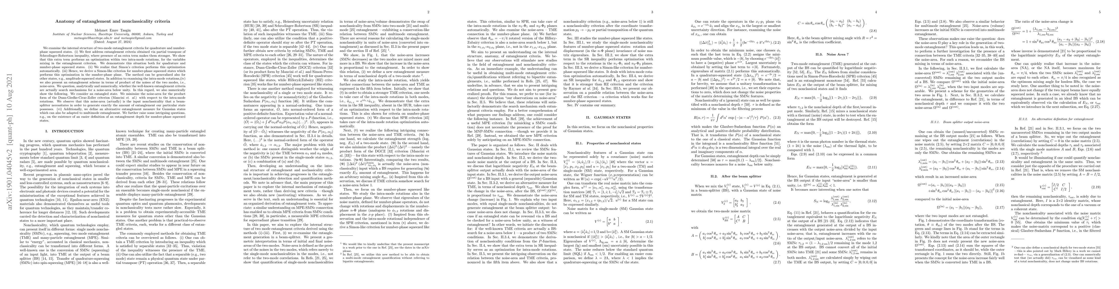 This paper explores the structure of entanglement criteria for quadrature and number-phase squeezed states, showing that Simon's criterion optimizes intra-mode rotations. It also proposes a Simon-like criterion for number-phase squeezed states and investigates whether existing entanglement criteria are searching for a noise-area below unity, linking this to the input nonclassicality required for generating specific entanglement levels.