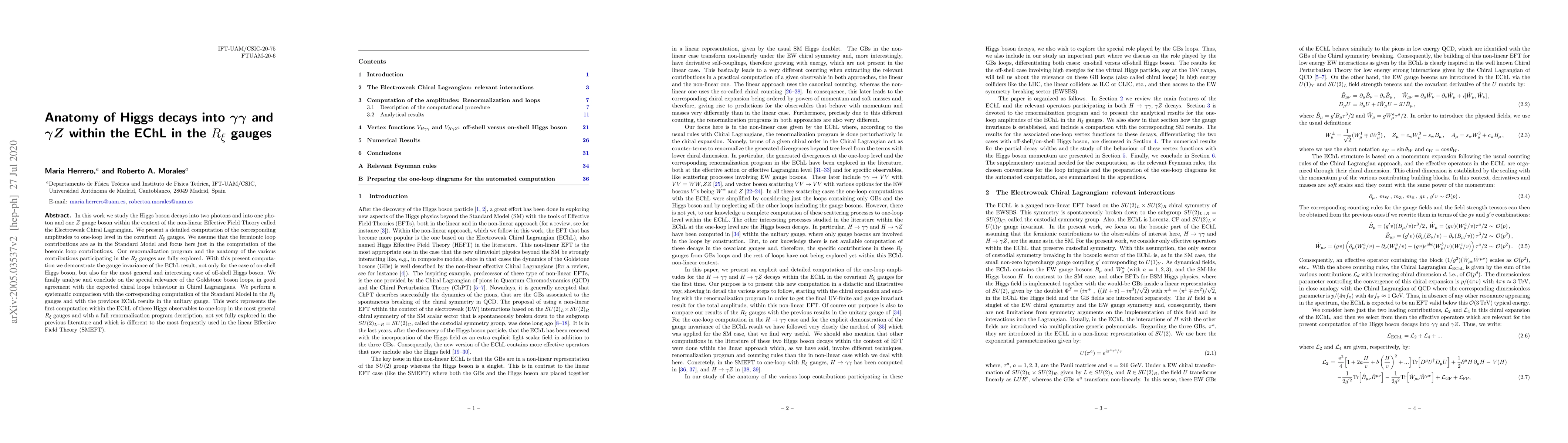 In this work we study the Higgs boson decays into two photons and into one photon and one $Z$ gauge boson within the context of the non-linear Effective Field Theory called the Electroweak Chiral Lagrangian. We present a detailed computation of the corresponding amplitudes to one-loop level in the covariant $R_\xi$ gauges. We assume that the fermionic loop contributions are as in the Standard Model and focus here just in the computation of the bosonic loop contributions. Our renormalization program and the anatomy of the various contributions participating in the $R_\xi$ gauges are fully explored. With this present computation we demonstrate the gauge invariance of the EChL result, not only for the case of on-shell Higgs boson, but also for the most general and interesting case of off-shell Higgs boson. We finally analyse and conclude on the special relevance of the Goldstone boson loops, in good agreement with the expected chiral loops behaviour in Chiral Lagrangians. We perform a systematic comparison with the corresponding computation of the Standard Model in the $R_\xi$ gauges and with the previous EChL results in the unitary gauge. This work represents the first computation within the EChL of these Higgs observables to one-loop in the most general $R_\xi$ gauges and with a full renormalization program description, not yet fully explored in the previous literature and which is different to the most frequently used in the linear Effective Field Theory (SMEFT).