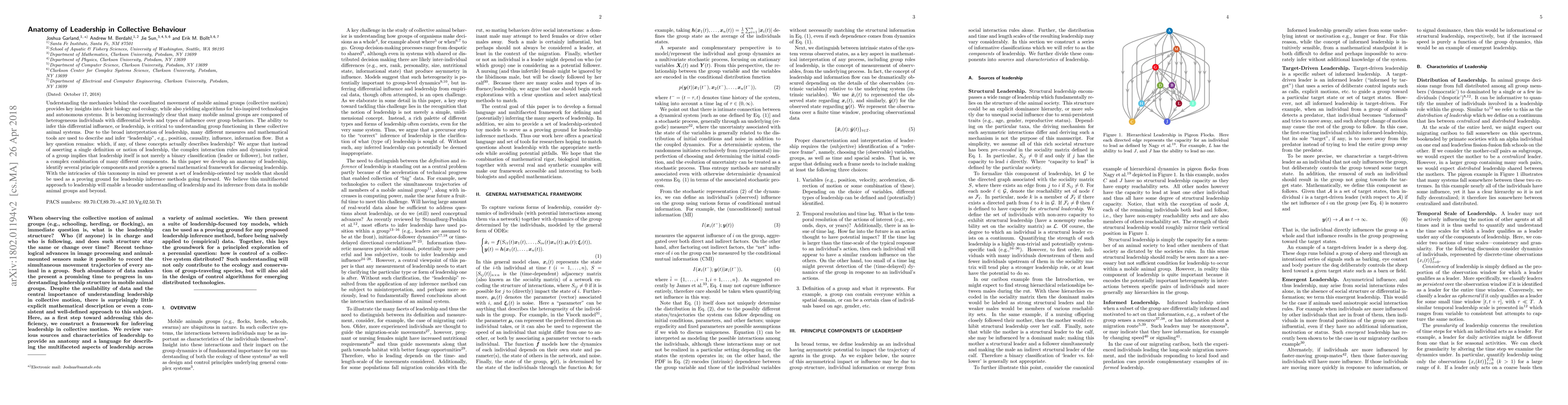 This paper develops an anatomy of leadership in collective animal behavior, arguing that leadership is a complex combination of various components rather than a binary classification. It proposes a mathematical framework and toy models to better understand and infer leadership in diverse mobile animal groups.