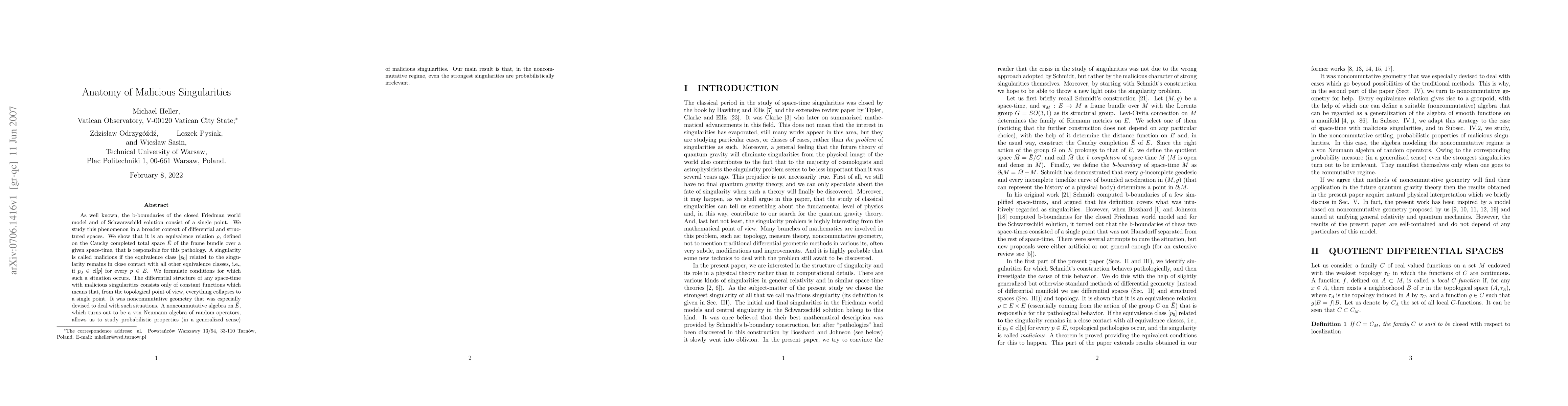 As well known, the b-boundaries of the closed Friedman world model and of Schwarzschild solution consist of a single point. We study this phenomenon in a broader context of differential and structured spaces. We show that it is an equivalence relation $\rho $, defined on the Cauchy completed total space $\bar{E}$ of the frame bundle over a given space-time, that is responsible for this pathology. A singularity is called malicious if the equivalence class $[p_0]$ related to the singularity remains in close contact with all other equivalence classes, i.e., if $p_0 \in \mathrm{cl}[p]$ for every $p \in E$. We formulate conditions for which such a situation occurs. The differential structure of any space-time with malicious singularities consists only of constant functions which means that, from the topological point of view, everything collapses to a single point. It was noncommutative geometry that was especially devised to deal with such situations. A noncommutative algebra on $\bar{E}$, which turns out to be a von Neumann algebra of random operators, allows us to study probabilistic properties (in a generalized sense) of malicious singularities. Our main result is that, in the noncommutative regime, even the strongest singularities are probabilistically irrelevant.