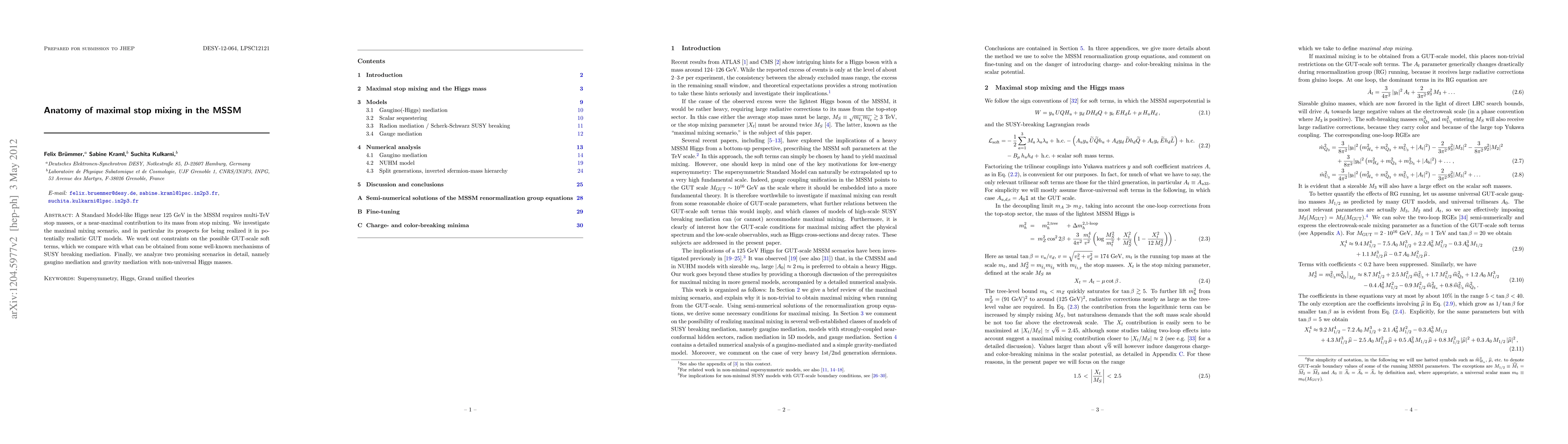 Researchers investigate maximal stop mixing in the Minimal Supersymmetric Standard Model (MSSM), exploring its potential in Grand Unified Theory (GUT) models and implications for SUSY breaking mediation.