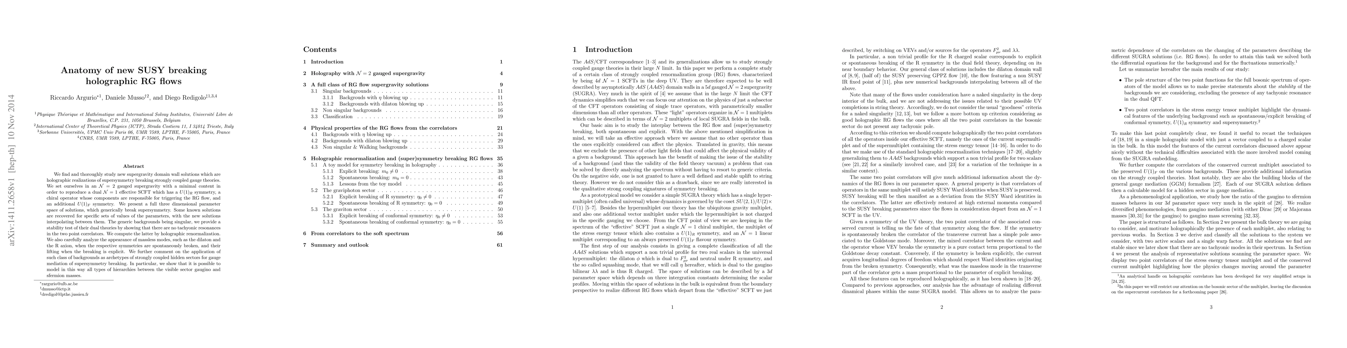 We find and thoroughly study new supergravity domain wall solutions which are holographic realizations of supersymmetry breaking strongly coupled gauge theories. We set ourselves in an N=2 gauged supergravity with a minimal content in order to reproduce a dual N=1 effective SCFT which has a U(1)_R symmetry, a chiral operator whose components are responsible for triggering the RG flow, and an additional U(1)_F symmetry. We present a full three dimensional parameter space of solutions, which generically break supersymmetry. Some known solutions are recovered for specific sets of values of the parameters, with the new solutions interpolating between them. The generic backgrounds being singular, we provide a stability test of their dual theories by showing that there are no tachyonic resonances in the two point correlators. We compute the latter by holographic renormalization. We also carefully analyze the appearance of massless modes, such as the dilaton and the R axion, when the respective symmetries are spontaneously broken, and their lifting when the breaking is explicit. We further comment on the application of such class of backgrounds as archetypes of strongly coupled hidden sectors for gauge mediation of supersymmetry breaking. In particular, we show that it is possible to model in this way all types of hierarchies between the visible sector gaugino and sfermion masses.
