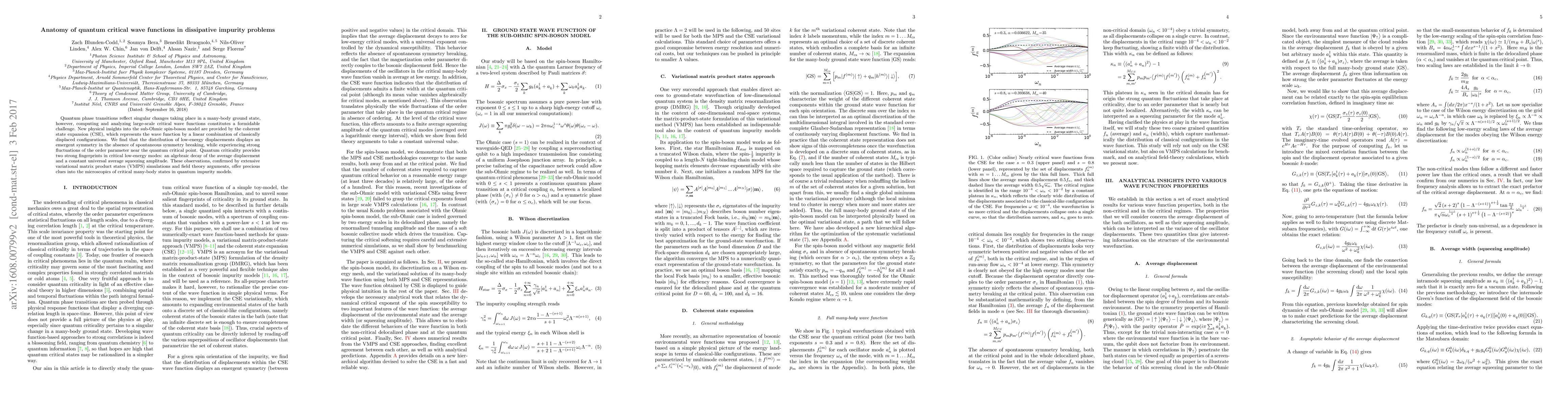 Quantum phase transitions reflect singular changes taking place in a many-body ground state, however, computing and analyzing large-scale critical wave functions constitutes a formidable challenge. New physical insights into the sub-Ohmic spin-boson model are provided by the coherent state expansion (CSE), which represents the wave function by a linear combination of classically displaced configurations. We find that the distribution of low-energy displacements displays an emergent symmetry in the absence of spontaneous symmetry breaking, while experiencing strong fluctuations of the order parameter near the quantum critical point. Quantum criticality provides two strong fingerprints in critical low-energy modes: an algebraic decay of the average displacement and a constant universal average squeezing amplitude. These observations, confirmed by extensive variational matrix product states (VMPS) simulations and field theory arguments, offer precious clues into the microscopics of critical many-body states in quantum impurity models.