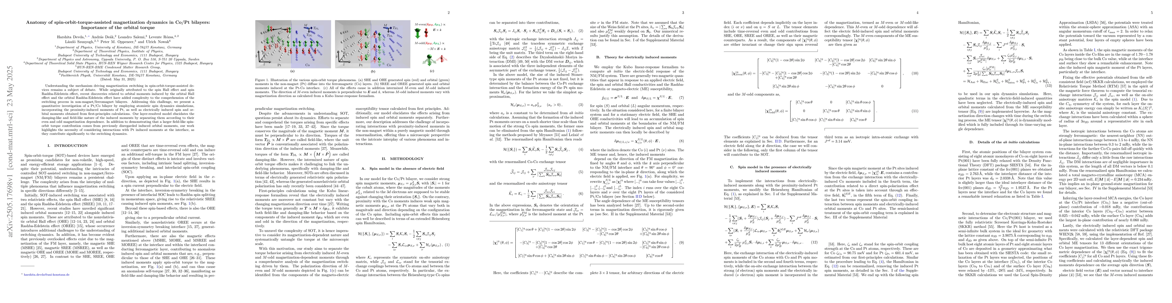The research utilizes atomistic spin dynamics simulations, incorporating proximity-induced moments of Pt and electrically induced spin and orbital moments derived from first-principles calculations to investigate a Pt/Co bilayer.