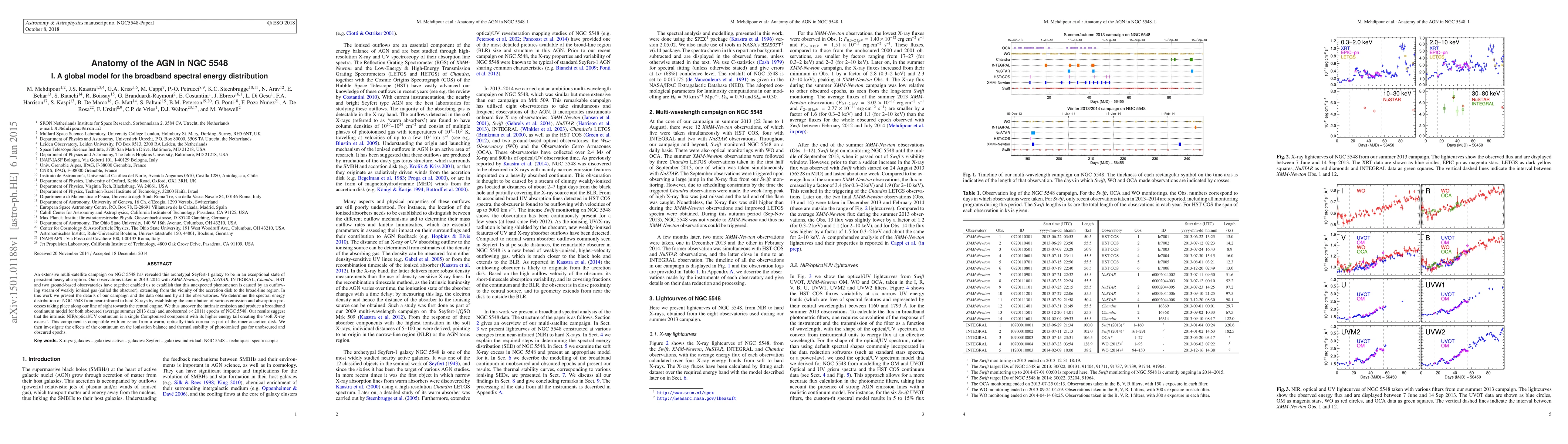 This paper presents a comprehensive analysis of NGC 5548, revealing persistent heavy absorption due to an outflowing stream of weakly ionised gas. The study constructs a broadband spectral energy distribution model, identifying a Comptonised component responsible for the 'soft X-ray excess' and suggesting it originates from a warm, optically-thick corona near the accretion disk.
