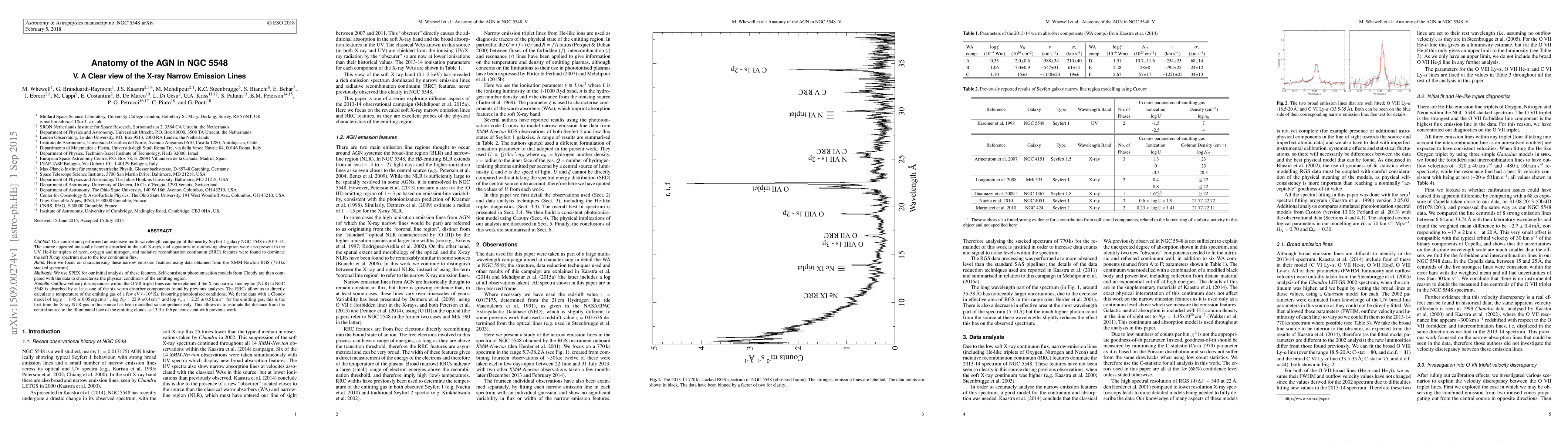 This study characterizes the X-ray narrow emission lines in NGC 5548 using XMM-Newton RGS data, revealing outflow velocity discrepancies explained by absorption from warm absorber components. The analysis indicates a temperature of a few eV and photoionised conditions, with a comprehensive model estimating the distance to the emitting gas at $13.9 \pm 0.6$ pc.
