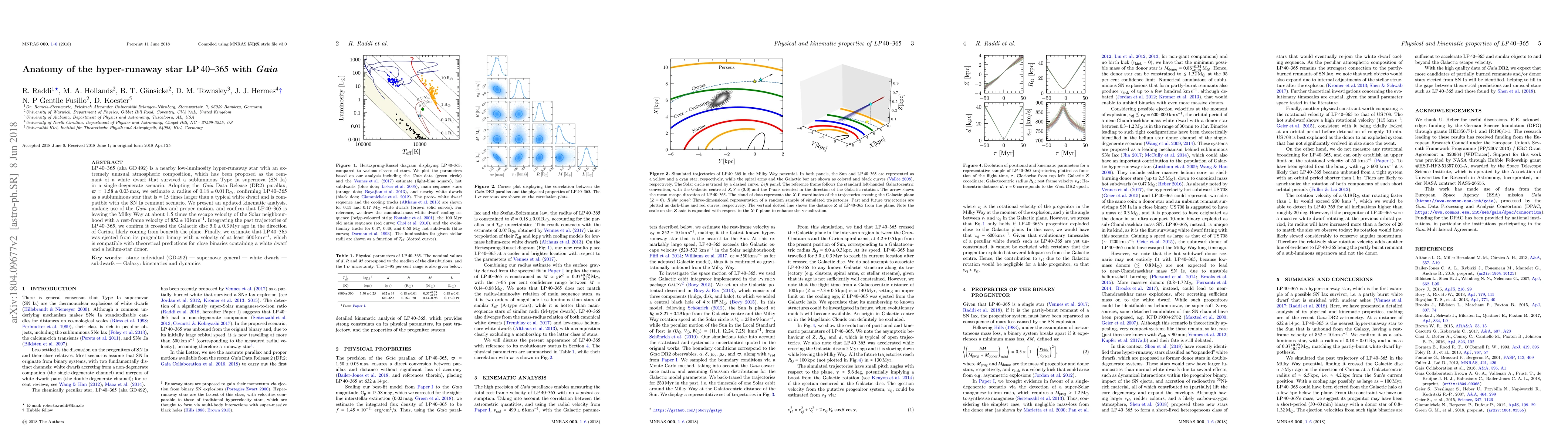 LP 40-365 (aka GD 492) is a nearby low-luminosity hyper-runaway star with an extremely unusual atmospheric composition, which has been proposed as the remnant of a white dwarf that survived a subluminous Type Ia supernova (SN Ia) in a single-degenerate scenario. Adopting the Gaia Data Release (DR2) parallax, 1.58 +/- 0.03 mas, we estimate a radius of 0.18 +/- 0.01 Rsun, confirming LP 40-365 as a subluminous star that is ~ 15 times larger than a typical white dwarf and is compatible with the SN Ia remnant scenario. We present an updated kinematic analysis, making use of the Gaia parallax and proper motion, and confirm that Lp 40-365 is leaving the Milky Way at about 1.5 times the escape velocity of the Solar neighbourhood with a rest-frame velocity of 852 +/- 10 km/s. Integrating the past trajectories of LP 40-365, we confirm it crossed the Galactic disc 5.0 +/- 0.3 Myr ago in the direction of Carina, likely coming from beneath the plane. Finally, we estimate that LP 40-365 was ejected from its progenitor binary with a velocity of at least 600 km/s, which is compatible with theoretical predictions for close binaries containing a white dwarf and a helium-star donor.