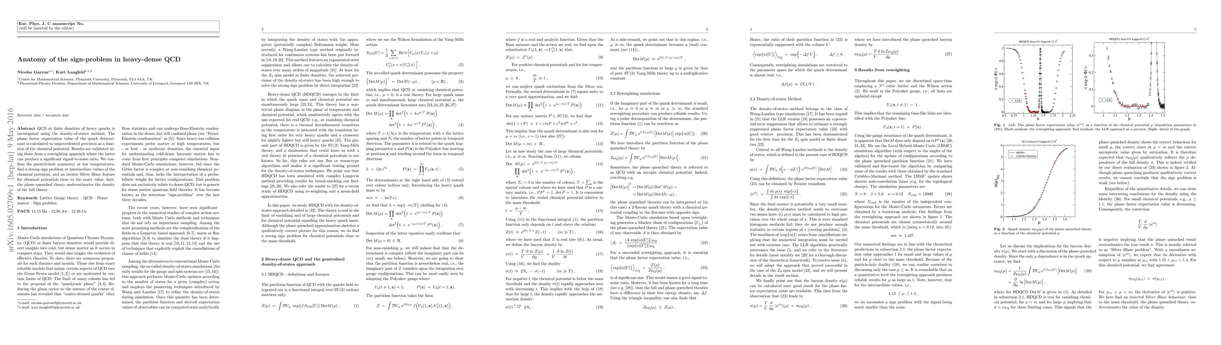 QCD at finite densities of heavy quarks is investigated using the density-of-states method. The phase factor expectation value of the quark determinant is calculated to unprecedented precision as a function of the chemical potential. Results are validated using those from a reweighting approach where the latter can produce a significant signal-to-noise ratio. We confirm the particle-hole symmetry at low temperatures, find a strong sign problem at intermediate values of the chemical potential, and an inverse Silver Blaze feature for chemical potentials close to the onset value: here, the phase quenched theory underestimates the density of the full theory.
