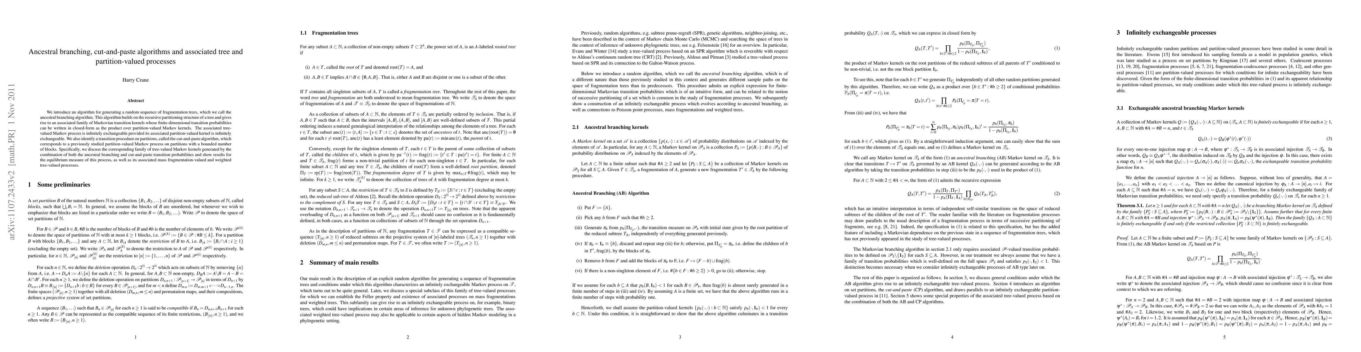We introduce an algorithm for generating a random sequence of fragmentation trees, which we call the ancestral branching algorithm. This algorithm builds on the recursive partitioning structure of a tree and gives rise to an associated family of Markovian transition kernels whose finite-dimensional transition probabilities can be written in closed-form as the product over partition-valued Markov kernels. The associated tree-valued Markov process is infinitely exchangeable provided its associated partition-valued kernel is infinitely exchangeable. We also identify a transition procedure on partitions, called the cut-and-paste algorithm, which corresponds to a previously studied partition-valued Markov process on partitions with a bounded number of blocks. Specifically, we discuss the corresponding family of tree-valued Markov kernels generated by the combination of both the ancestral branching and cut-and-paste transition probabilities and show results for the equilibrium measure of this process, as well as its associated mass fragmentation-valued and weighted tree-valued processes.